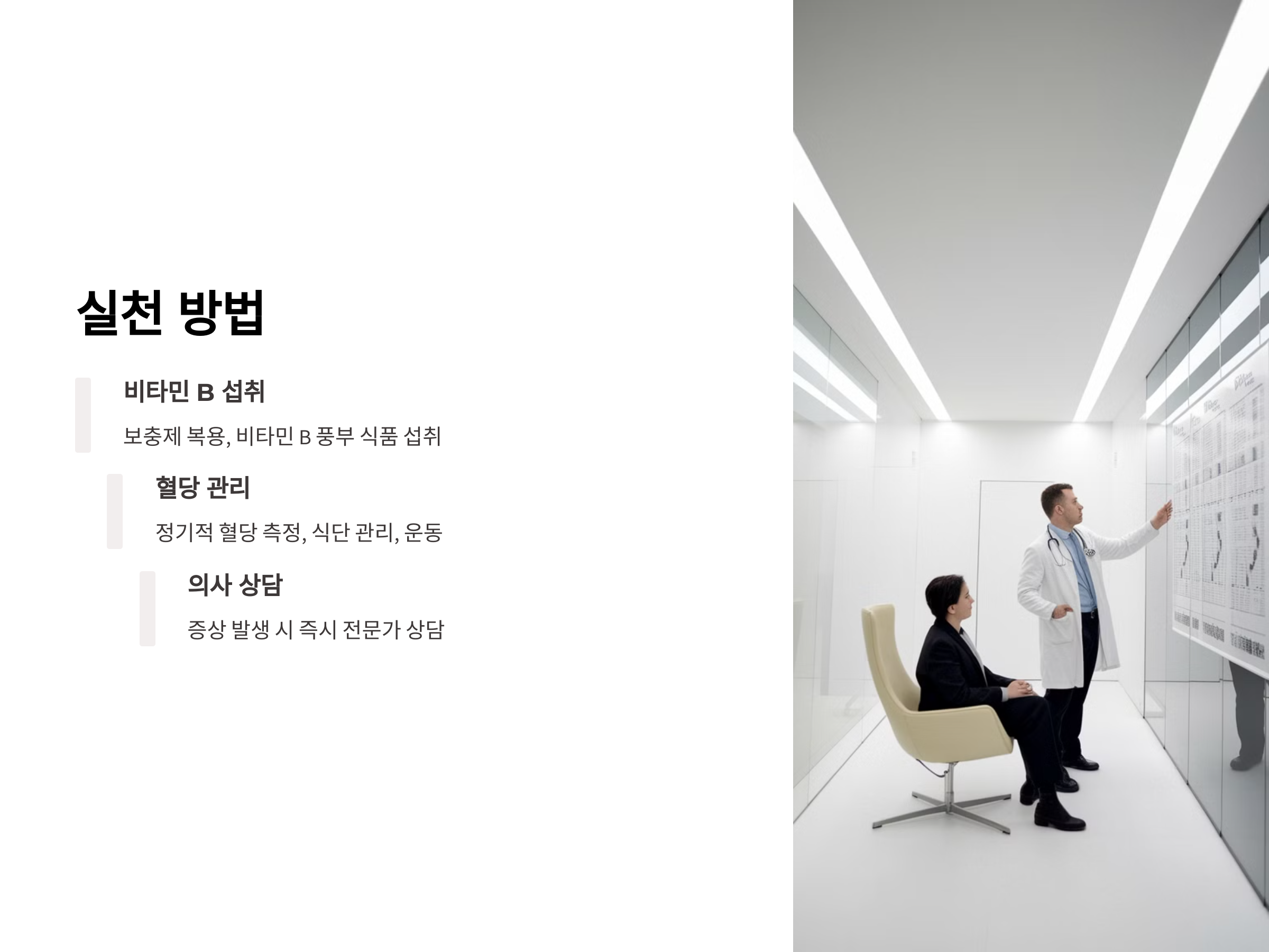 말초 신경병증이 의심되거나 증상이 나타날 경우, 즉시 의료 전문가와 상담하여 적절한 치료와 조치를 받는 것이 중요합니다. 특히 비타민 B군 보충이나 혈당 조절을 위한 처방은 전문가의 지도 아래 이루어져야 합니다.