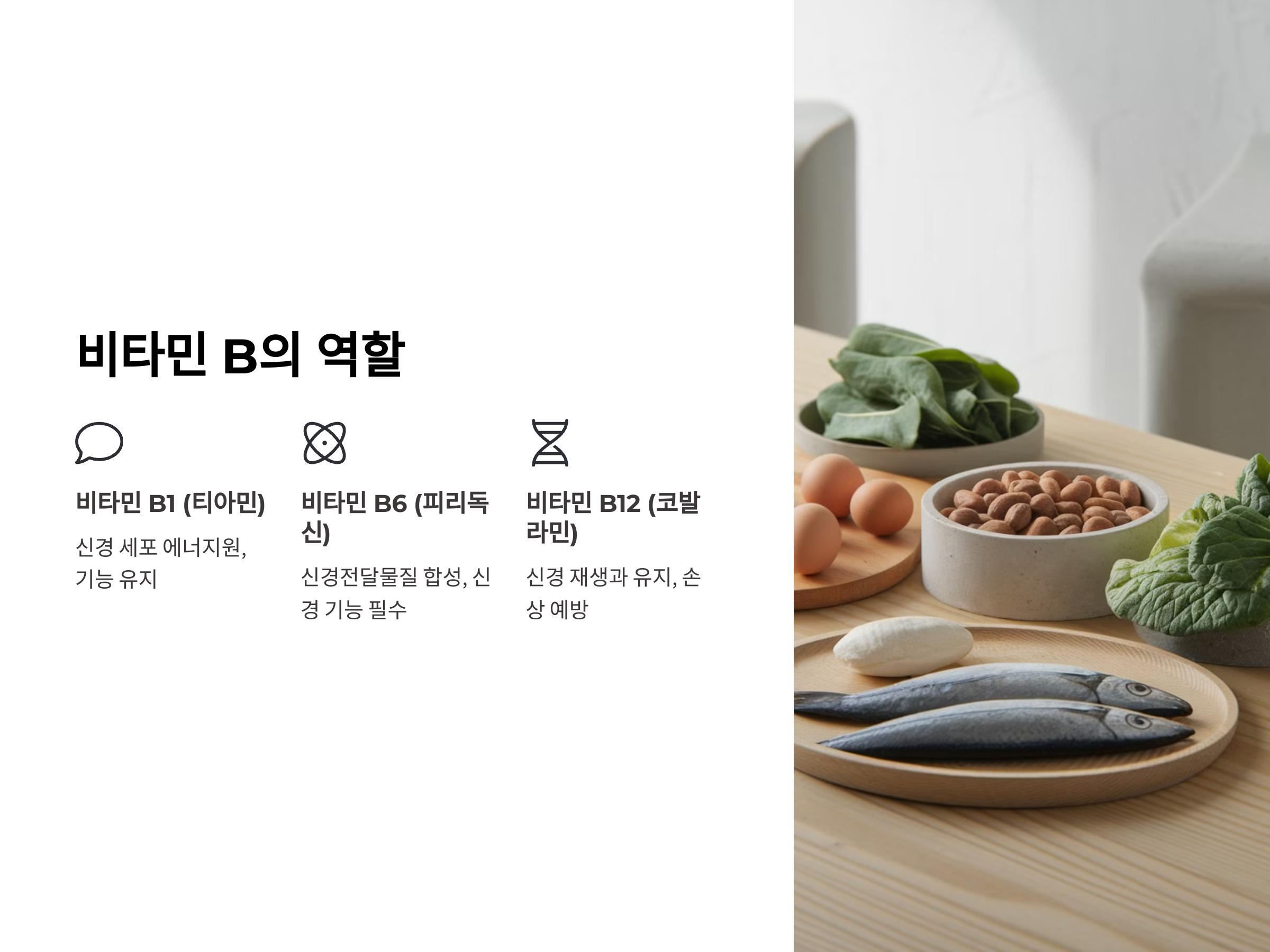 비타민 B군은 신경계 건강에 중요한 역할을 하며, 말초 신경병증을 예방하거나 개선하는 데 도움을 줄 수 있습니다. 비타민 B가 신경의 건강을 유지하는 데 중요한 이유는 다음과 같습니다.