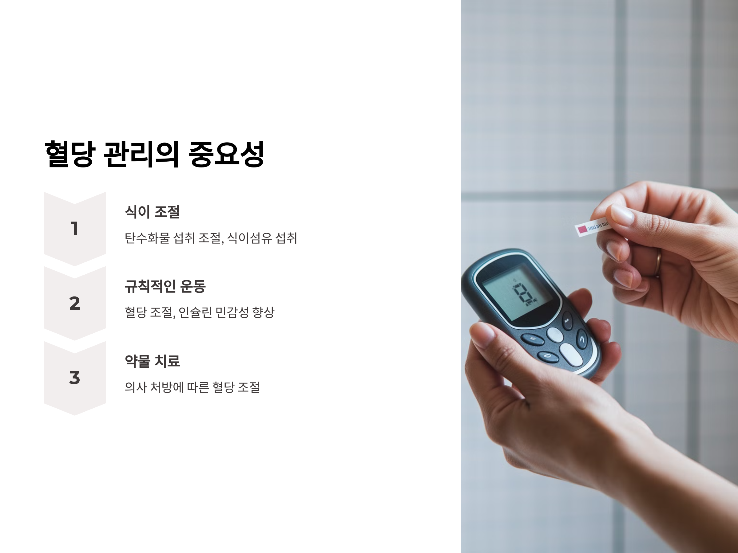 - 식이 조절: 혈당을 안정적으로 유지하기 위해서는 탄수화물 섭취를 조절하고, 식이섬유가 풍부한 음식을 섭취하는 것이 중요합니다.