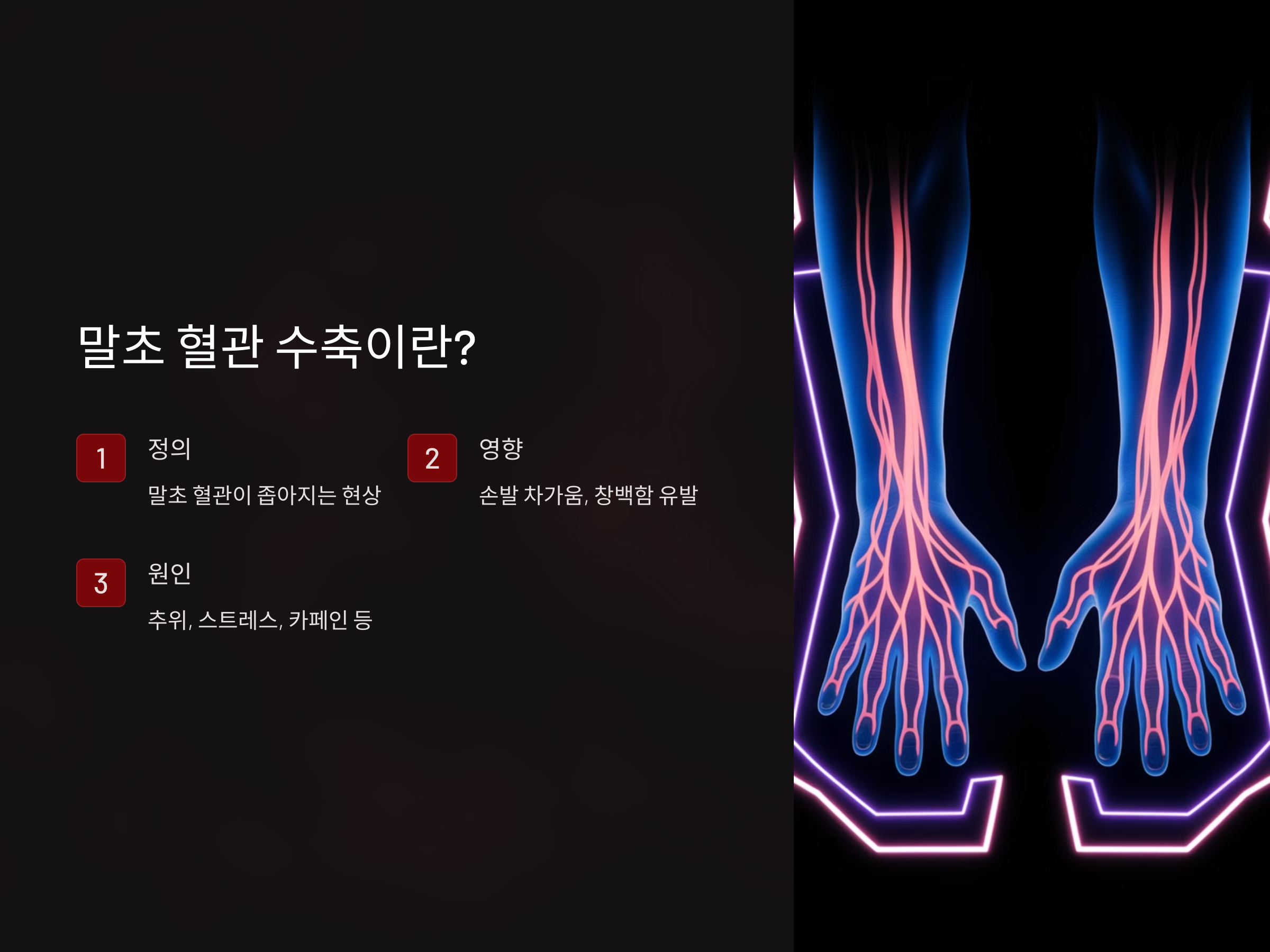 말초 혈관 수축은 손발이 창백하고 차가워지는 원인 중 하나로, 특히 추운 날씨에 자주 발생하는 현상입니다. 이러한 증상은 일시적인 불편함일 수 있지만, 장기적으로 나타날 경우 혈액순환 문제나 다른 건강상의 문제가 있을 수 있습니다. 이 글에서는 말초 혈관 수축의 원인과 증상, 그리고 이를 해결할 수 있는 방법에 대해 알아보겠습니다.
