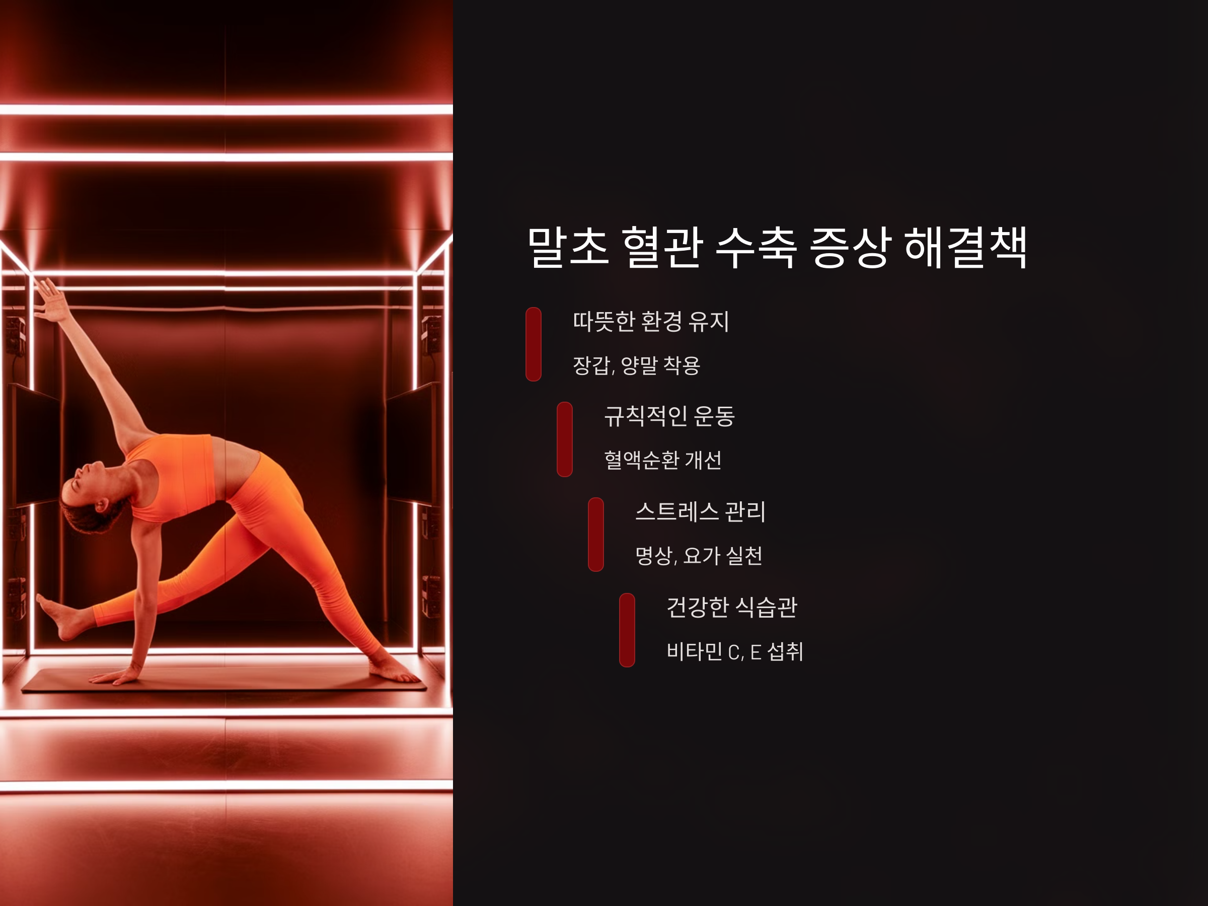 스트레스는 말초 혈관 수축을 유발할 수 있으므로, 스트레스 관리가 필요합니다. 명상, 요가, 심호흡 등은 자율신경계를 안정시켜 혈액순환을 돕는 데 효과적입니다. 또한, 충분한 휴식과 수면을 취하는 것도 중요합니다.