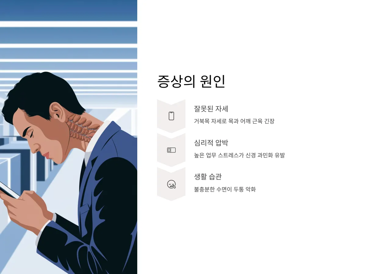 긴장성 두통의 가장 큰 원인은 정신적 스트레스입니다. 마감 일정에 쫓기거나 인간관계의 긴장 상태가 계속되면, 뇌가 ‘위기 상황’으로 인식하면서 자율신경계가 과도하게 반응하고, 이로 인해 신체 전반에 걸쳐 긴장이 유발됩니다. 또한 잘못된 자세로 인한 근육 긴장, 불규칙한 수면, 카페인 과다 섭취, 눈의 피로 등도 주요 유발 요인으로 지목됩니다.