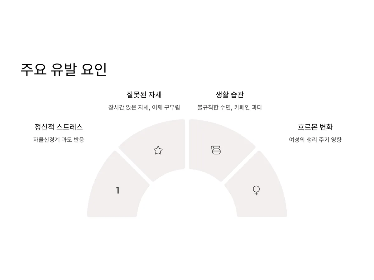 특히 ‘앉은 자세’가 장시간 지속되거나, 습관적으로 어깨를 구부리는 자세는 목과 머리로 가는 혈류를 저해해 두통을 심화시킵니다. 여성의 경우 생리 주기와 호르몬 변화로 인해 긴장성 두통이 유발되거나 심화되는 경향도 있기 때문에, 자신의 생활패턴을 꼼꼼히 살피는 것이 예방의 출발점이 됩니다.
