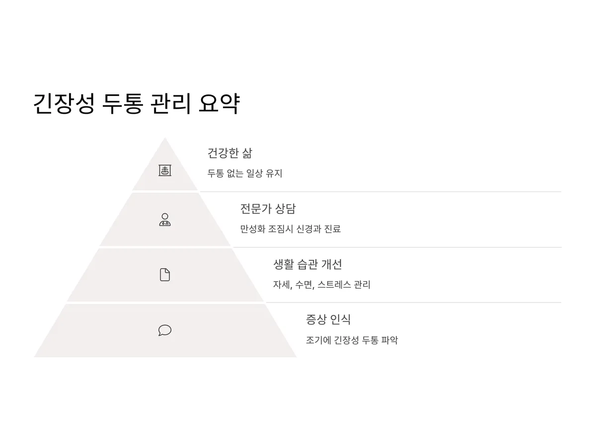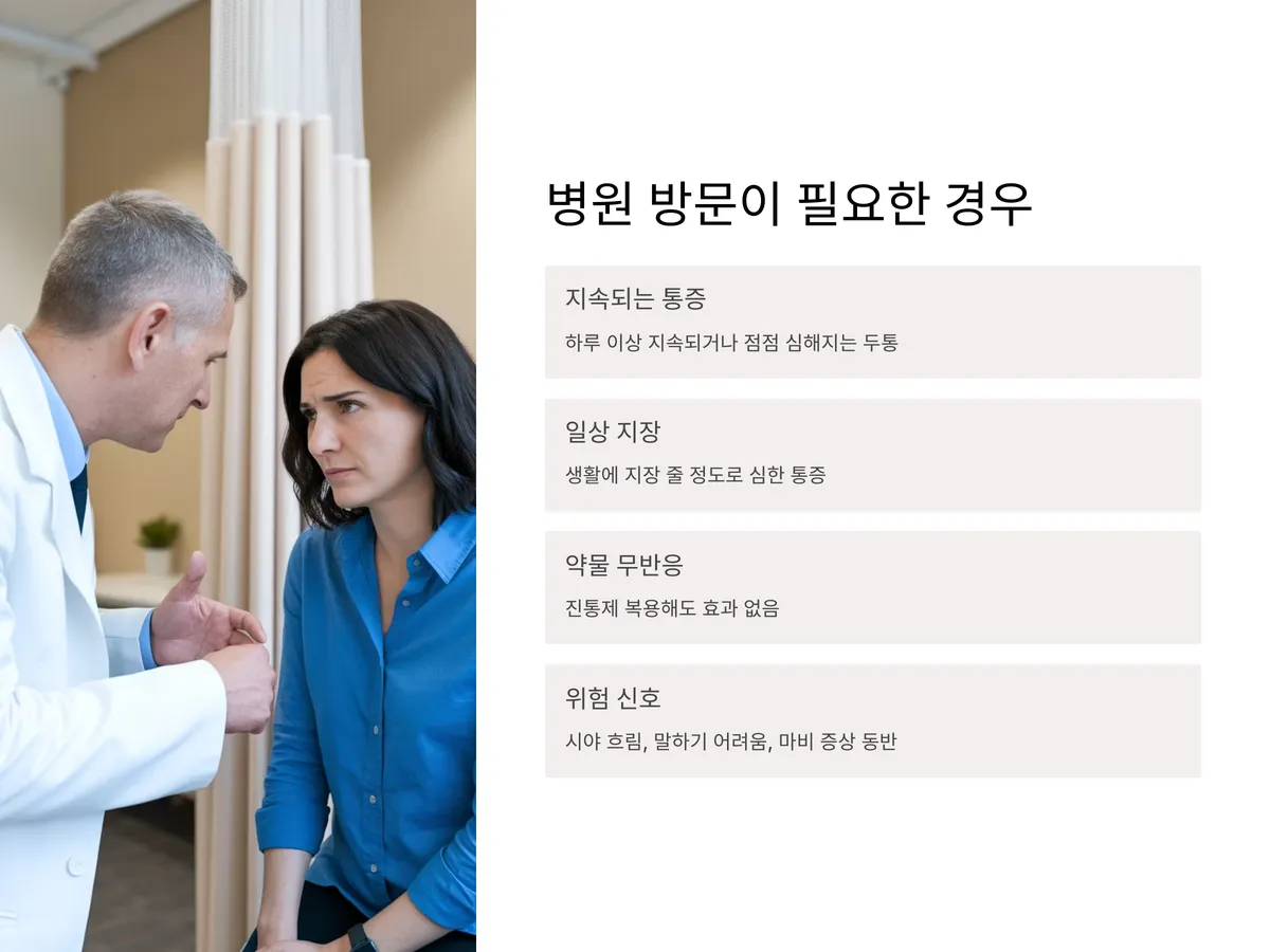 긴장성 두통은 대부분 생활습관 개선으로 호전되지만, 다음과 같은 경우에는 반드시 전문의를 찾아야 합니다.