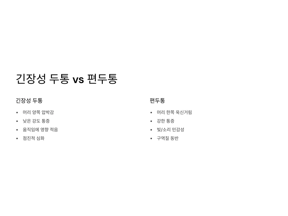 긴장성 두통과 편두통은 증상만으로 혼동되기 쉬우나, 몇 가지 명확한 차이가 존재합니다. 먼저 긴장성 두통은 머리를 졸리는 듯한 압박감, 통증이 양쪽에서 느껴지며 일반적으로 움직임에 따라 심해지지 않습니다. 반면 편두통은 보통 머리 한쪽에서 욱신거리는 통증이 나타나고, 빛이나 소리에 민감해지며 구역질을 동반할 수 있습니다.