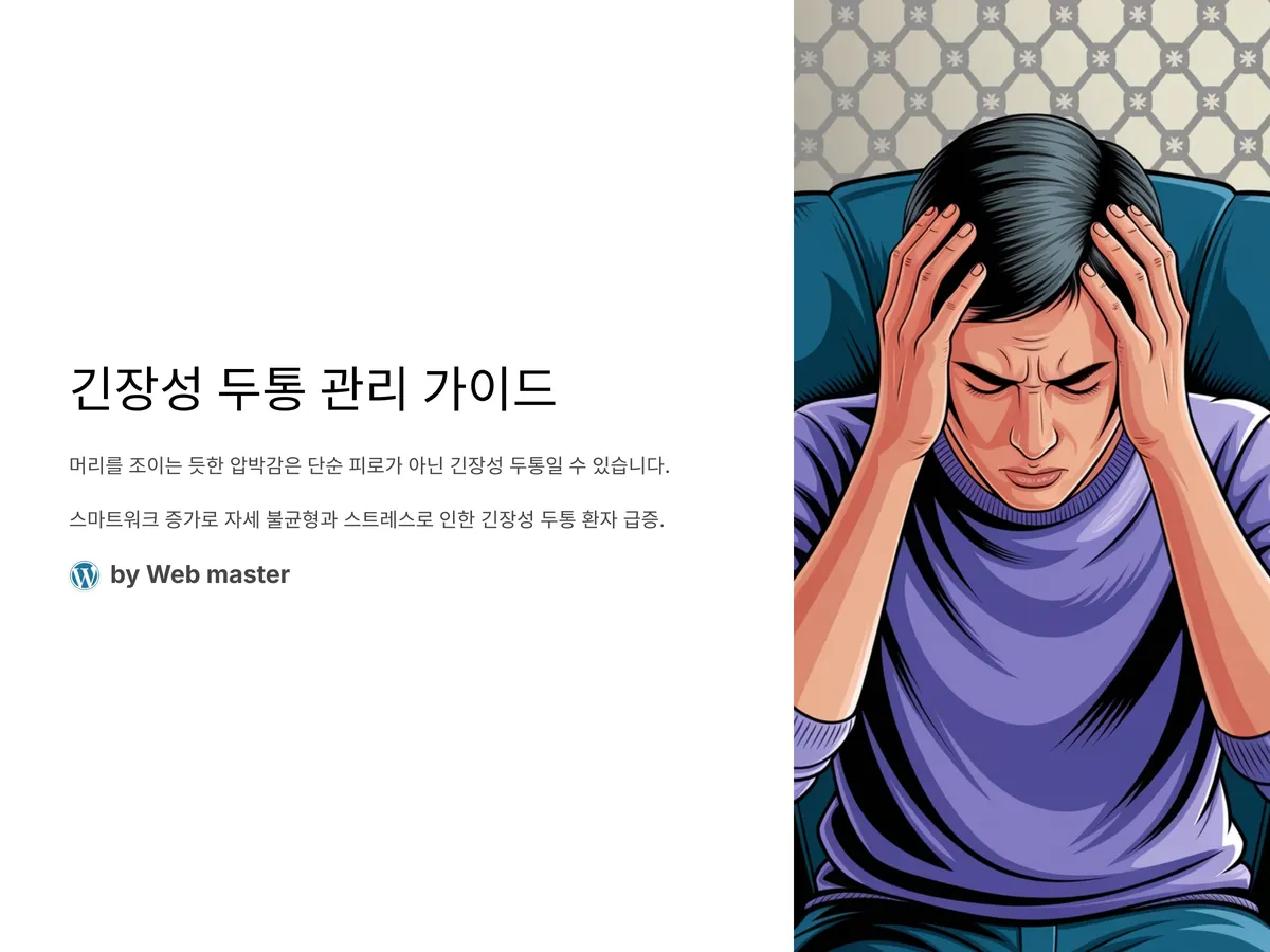 갑작스럽게 머리를 조이는 듯한 압박감이 들거나, 마치 두건을 꽉 눌러쓴 듯한 느낌을 자주 경험하고 있나요? 이는 단순한 피로나 스트레스의 증상이 아닌, 긴장성 두통일 가능성이 높습니다. 최근 건강 트렌드에서는 ‘지속되는 두통’을 단순 증상으로 넘기지 말고 원인을 찾아 대응해야 한다는 목소리가 커지고 있습니다. 2025년 들어 스마트워크와 재택근무가 늘어나면서 오히려 자세 불균형과 정신적 스트레스로 인한 긴장성 두통 환자 수가 급증하고 있는 것이 그 반증입니다. 특히 이 두통은 뇌혈관 질환과 달리 긴 시간 조용히 삶을 갉아먹는 특성을 가지기 때문에, 초기 인식과 습관 개선이 매우 중요합니다.