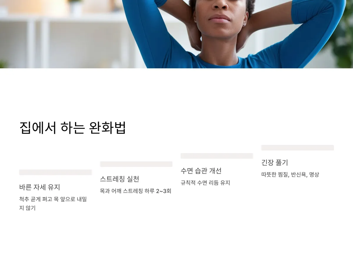 긴장성 두통은 생활습관의 개선만으로도 상당한 완화 효과를 볼 수 있습니다. 가장 기본이 되는 것은 바른 자세 유지입니다. 특히 앉은 자세에서 척추를 곧게 펴고 목을 앞으로 내밀지 않는 연습이 필요합니다. 또 목과 어깨 스트레칭을 하루 2~3회 정도 꾸준히 하면 혈류 순환이 개선되어 증상 완화에 효과적입니다.