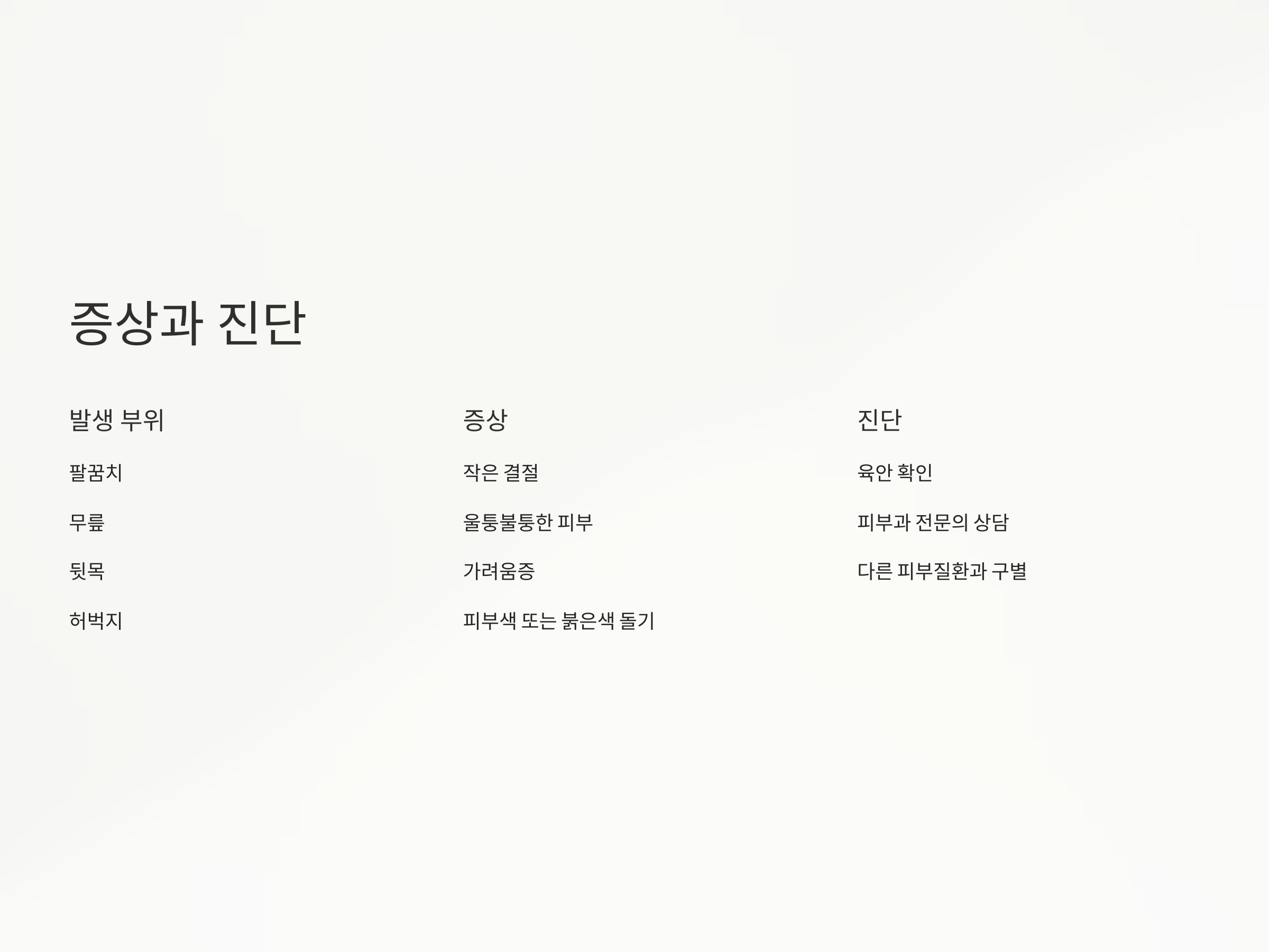 이 질환은 기본적으로 육안으로 확인할 수 있으며, 피부과 전문의를 통해 진단받을 수 있습니다. 피부가 부드럽고 평평하게 느껴지는 다른 질환과의 구별이 필요할 수 있습니다.