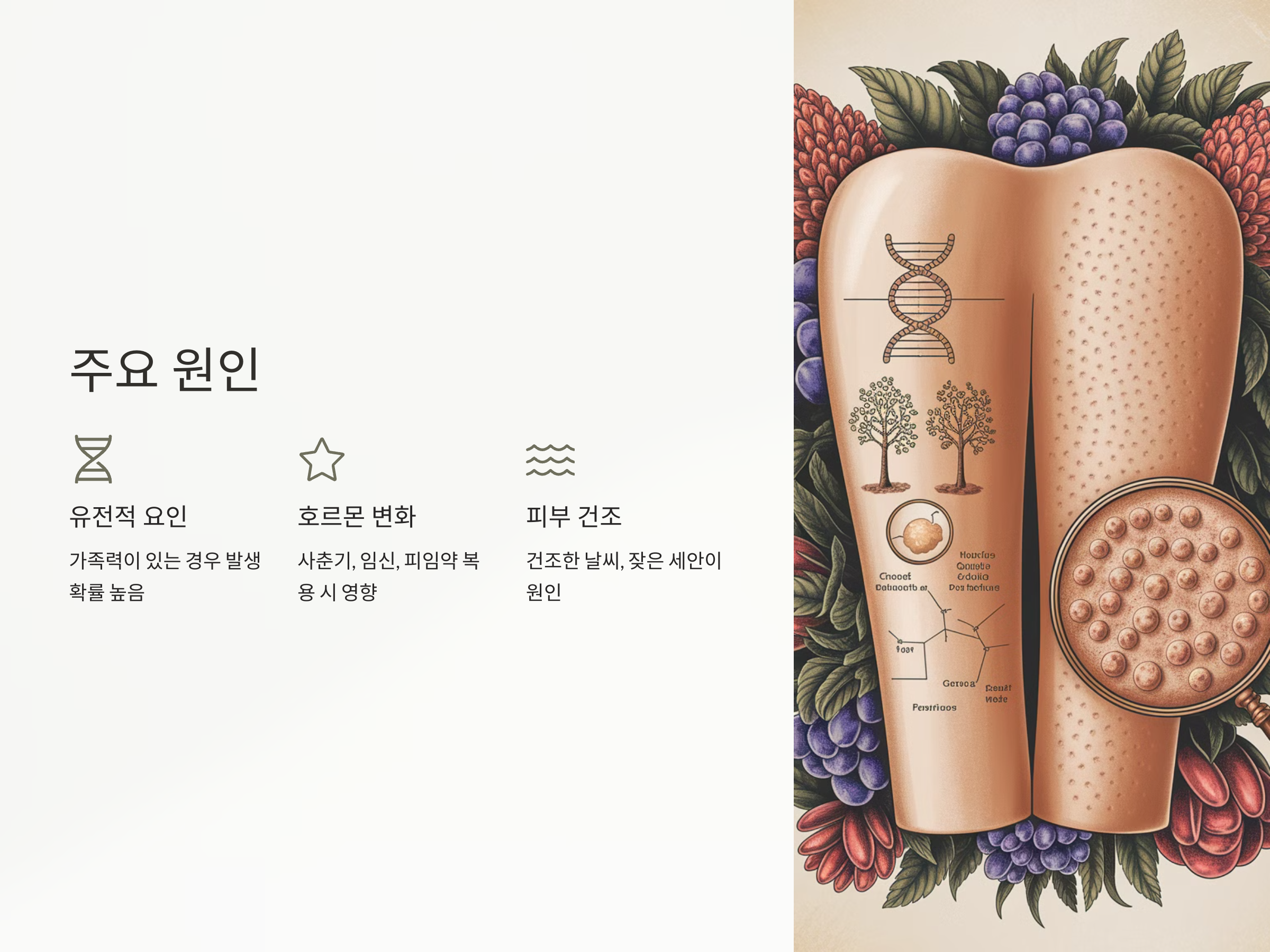 - 피부 건조: 건조한 날씨나 자주 씻는 습관, 자극적인 화장품 사용 등이 피부의 수분을 부족하게 만들고 각질 축적을 유발할 수 있습니다.