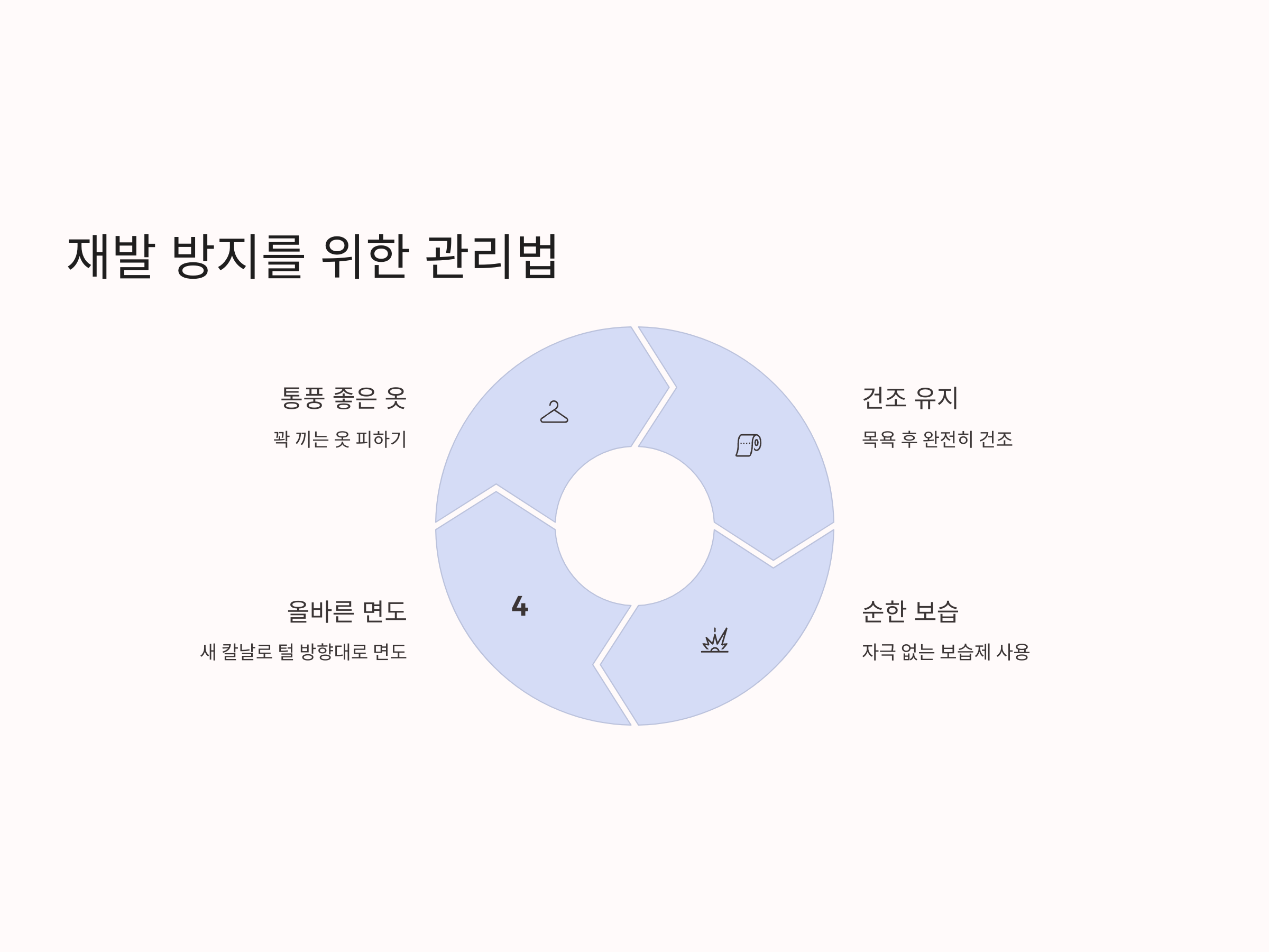 목욕 후에는 완전히 건조한 상태를 유지하고, 특히 민감 부위는 자극이 가지 않도록 순한 보습제를 사용하는 것이 도움이 됩니다. 아울러 면도 시에는 항상 새로운 칼날을 사용하고, 면도 방향은 털의 방향대로 부드럽게 진행해야 피부 손상을 최소화할 수 있습니다. 주기적인 각질 제거도 도움이 되지만, 과도한 스크럽은 오히려 모낭을 자극할 수 있으므로 주의가 필요합니다.