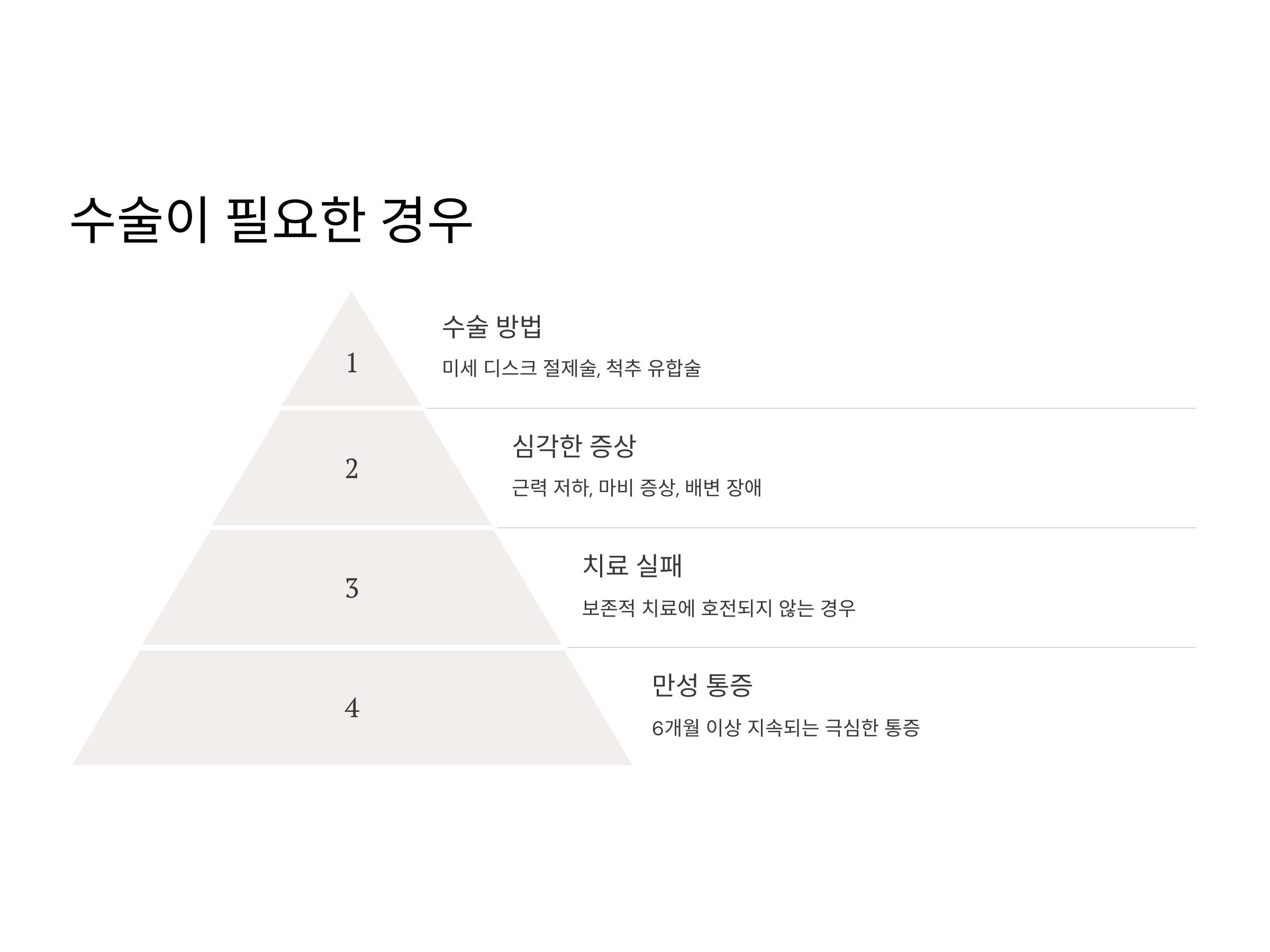 일반적으로 좌골신경통은 보존적 치료로 호전될 수 있지만, 다음과 같은 경우에는 수술이 필요할 수도 있습니다.