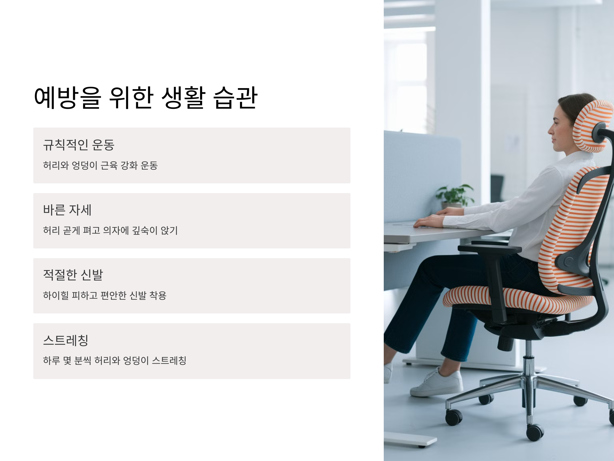 좌골신경 압박을 예방하려면 평소 생활 습관을 개선하는 것이 중요합니다.