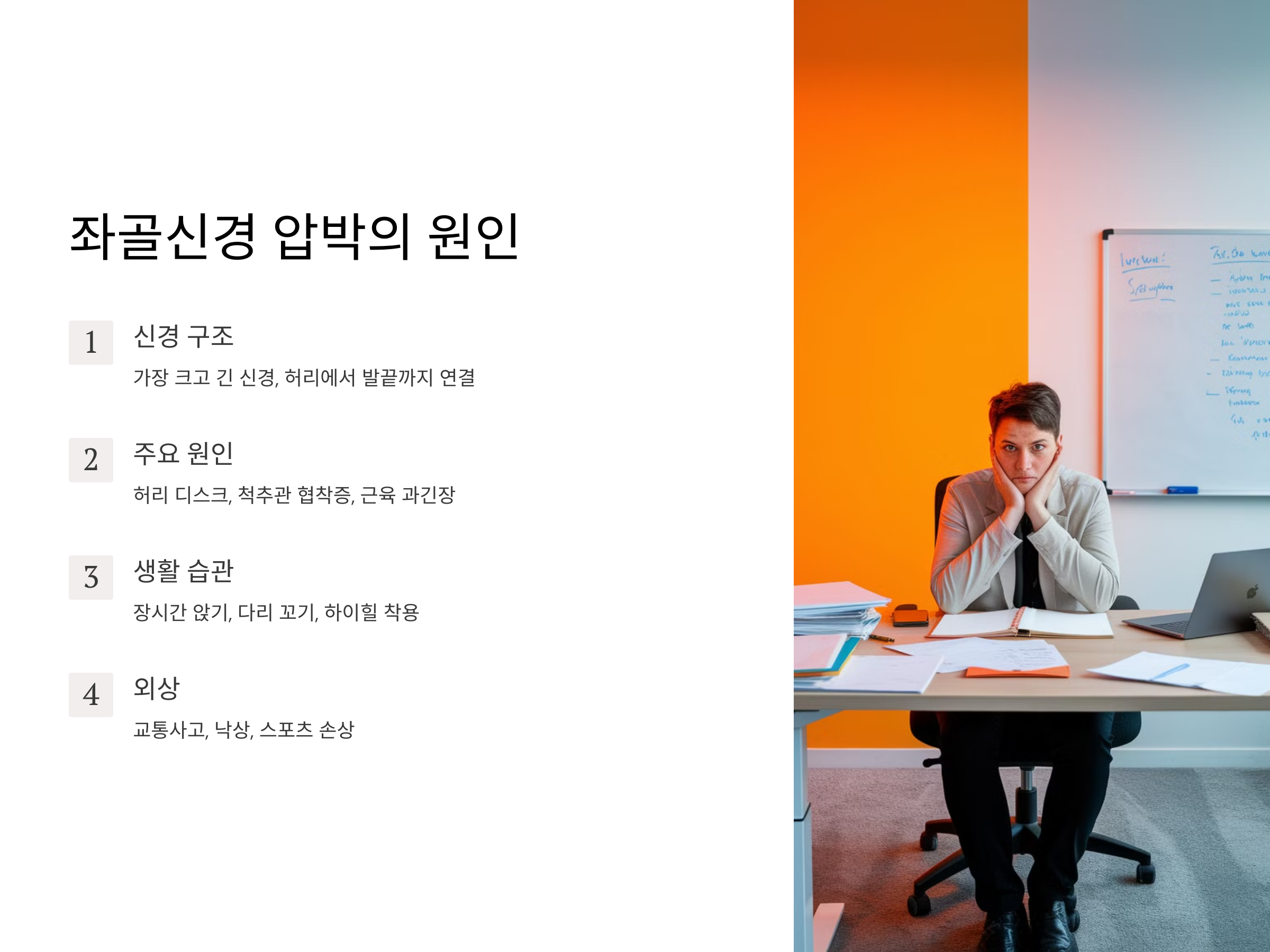 장시간 앉아있거나 다리를 꼬는 습관, 하이힐 착용 등이 좌골신경 압박의 원인이 될 수 있습니다.