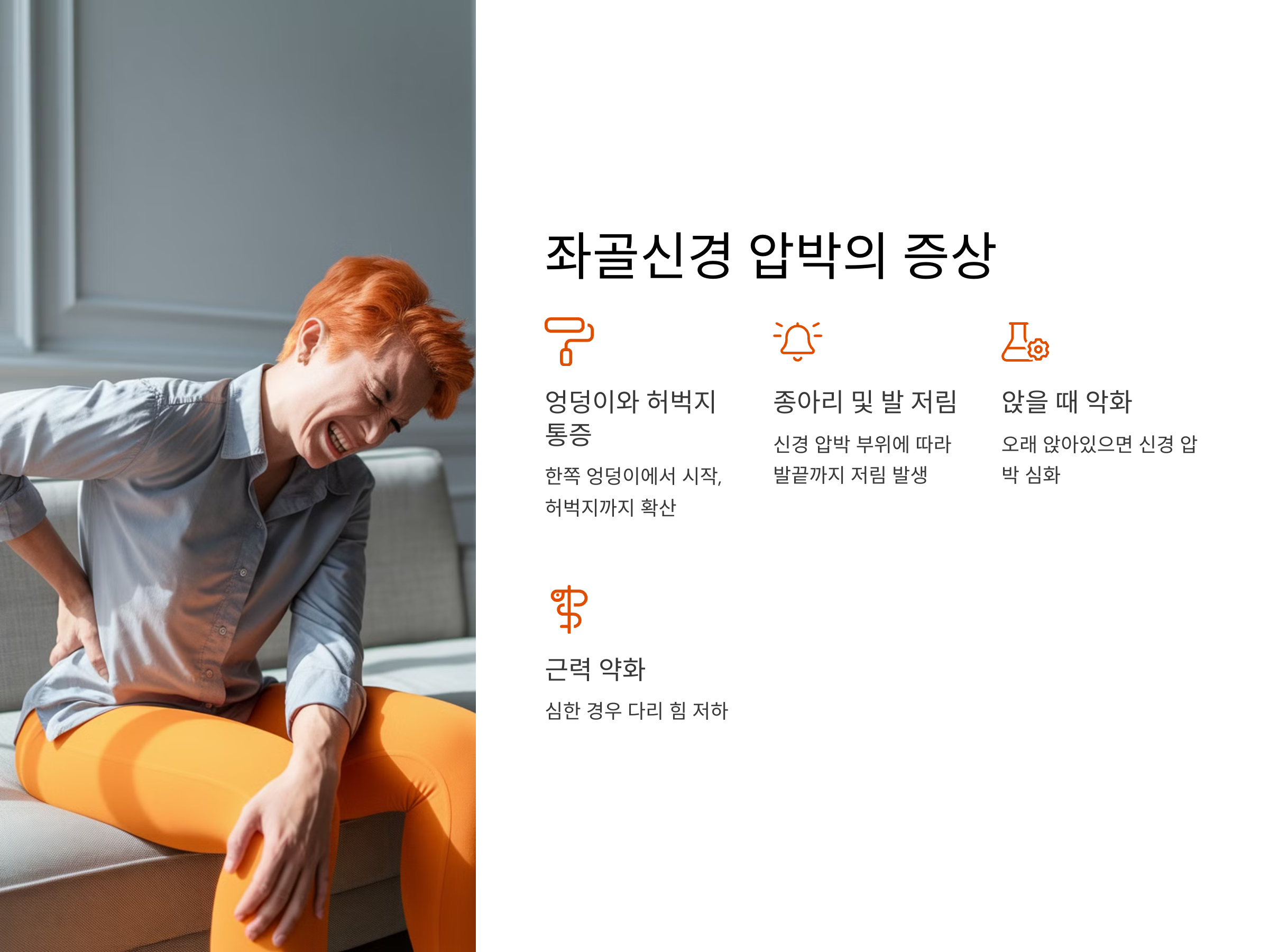 좌골신경이 눌리면 주로 한쪽 엉덩이에서 시작되는 통증이 허벅지까지 내려갑니다. 오래 앉아 있거나 걸을 때 통증이 심해질 수 있습니다.