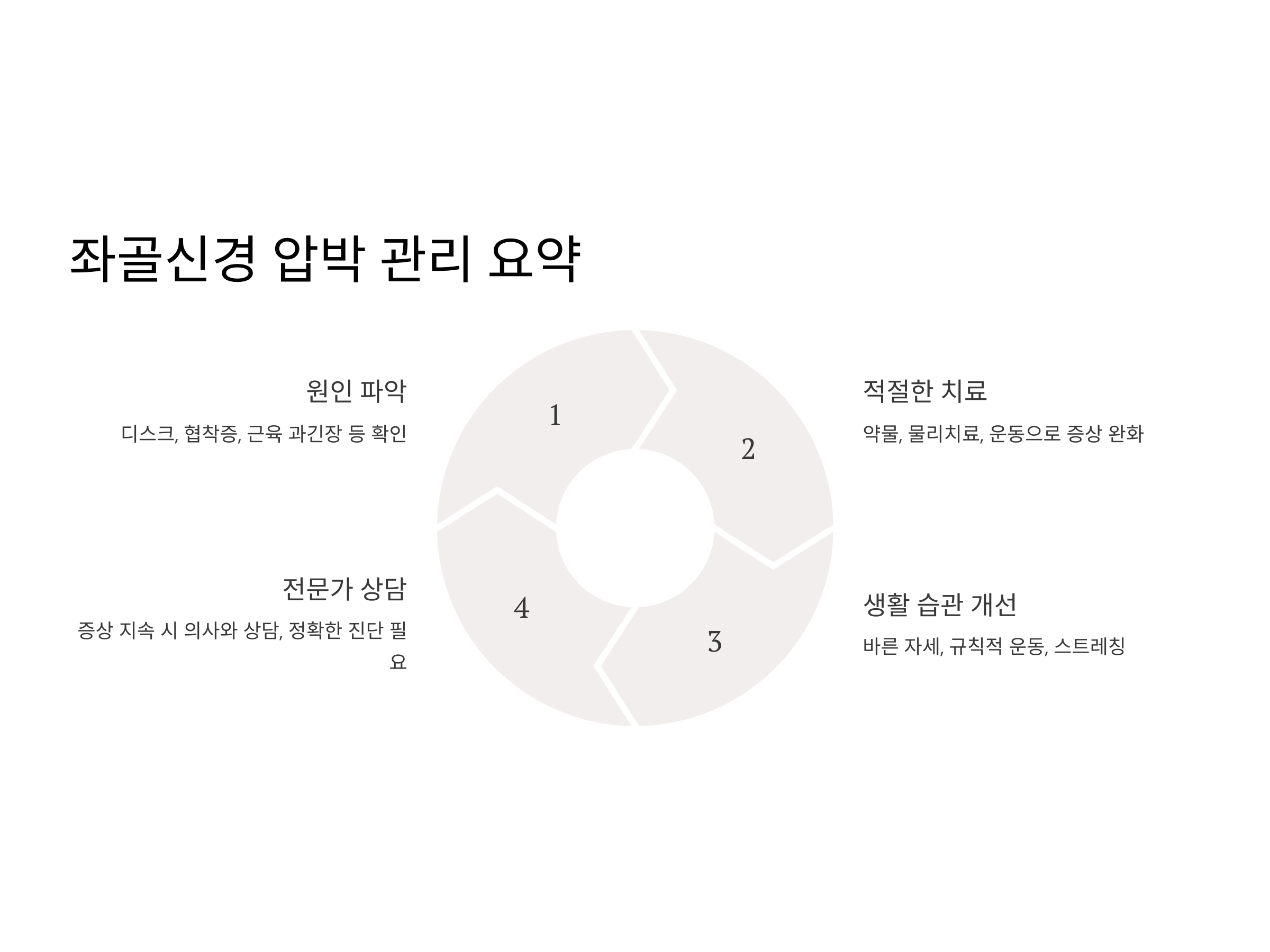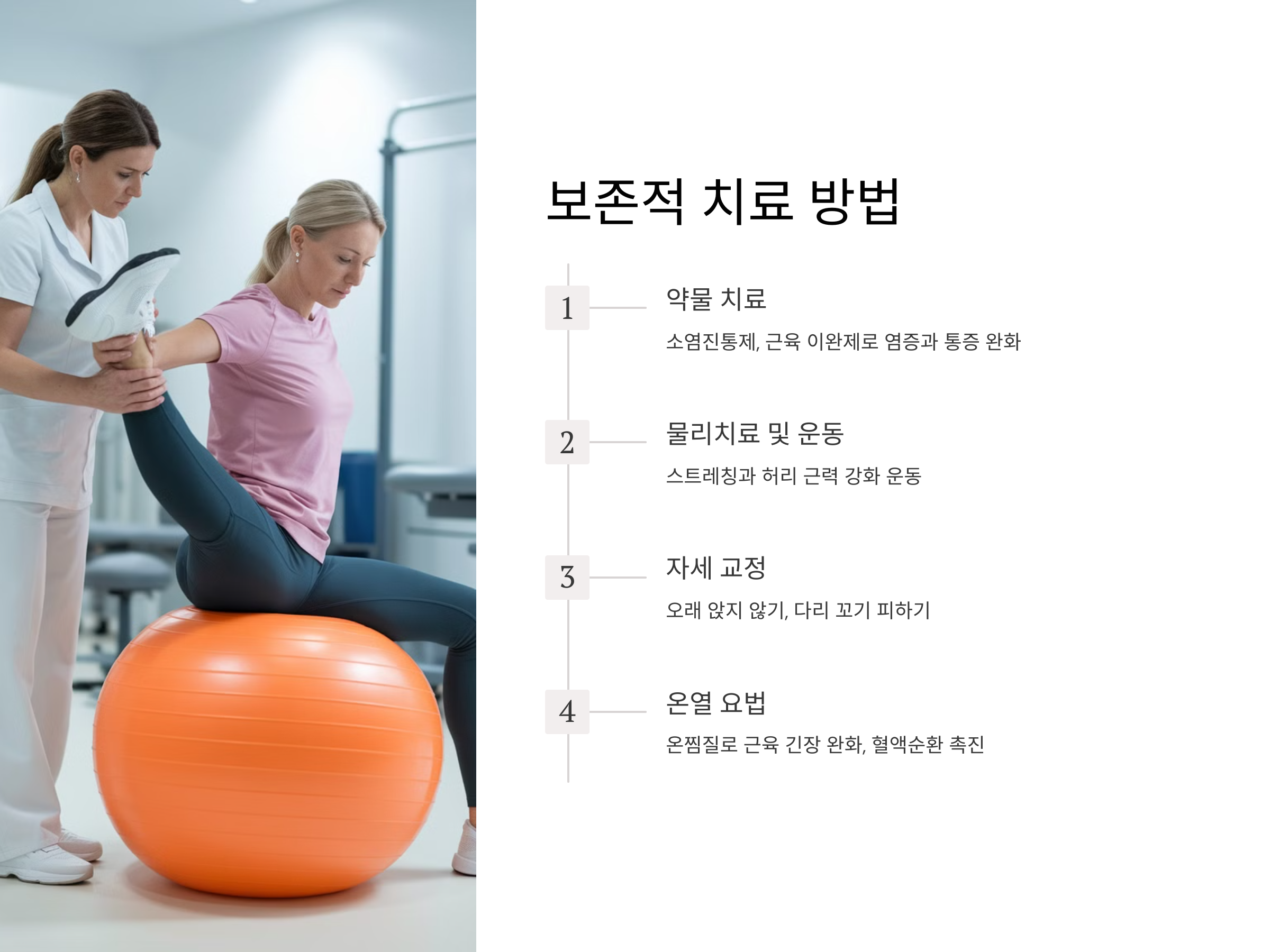 좌골신경 압박으로 인한 통증을 완화하기 위해 다양한 치료 방법이 있습니다. 증상의 정도에 따라 보존적 치료부터 수술까지 고려될 수 있습니다.