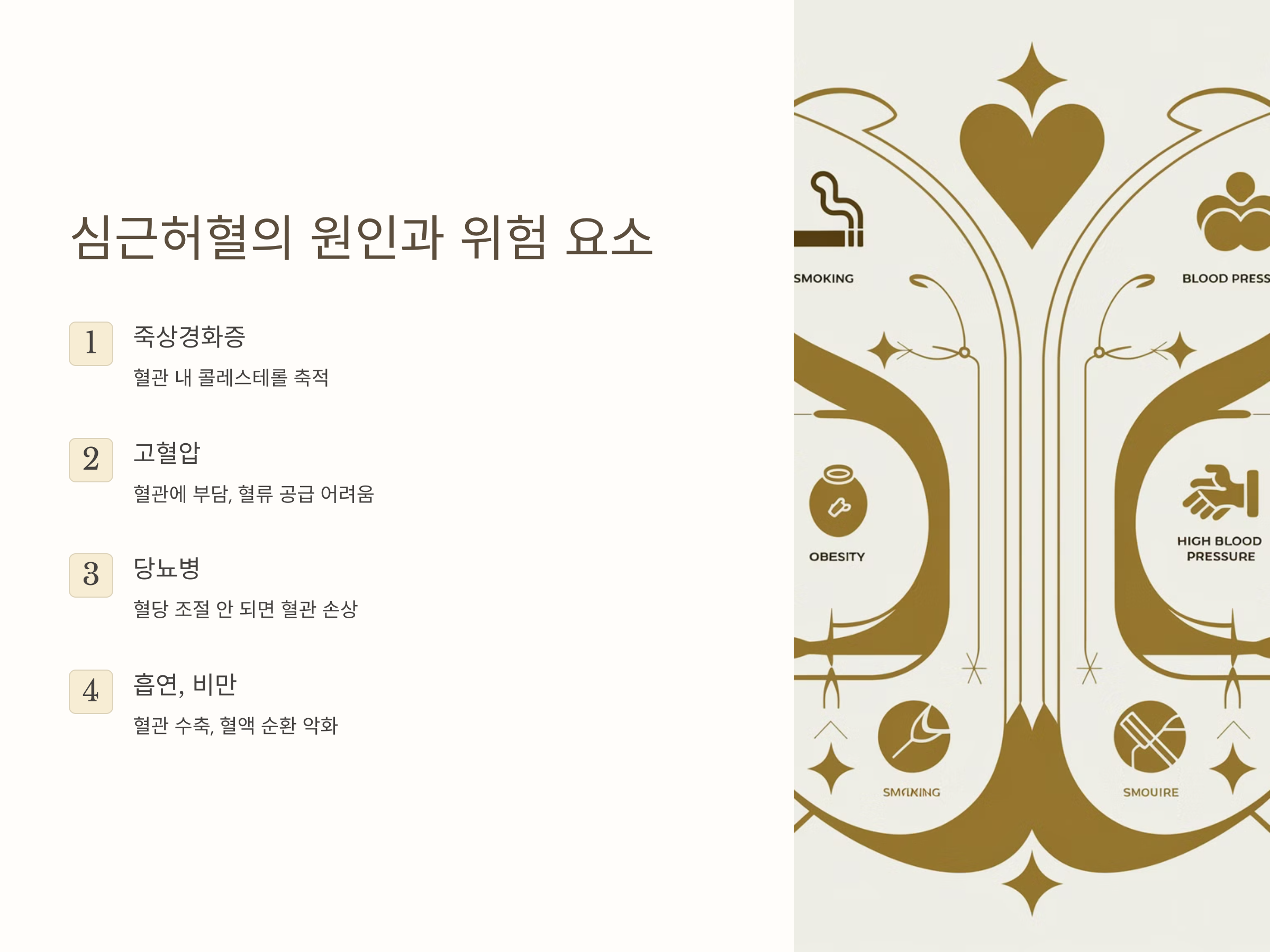 심근허혈은 심장 근육에 혈액을 공급하는 관상동맥이 좁아지거나 막히면서 산소 공급이 부족해지는 상태를 의미합니다. 주된 원인은 죽상경화증(동맥경화)이며, 혈관 내 콜레스테롤 축적이 문제를 일으킵니다.