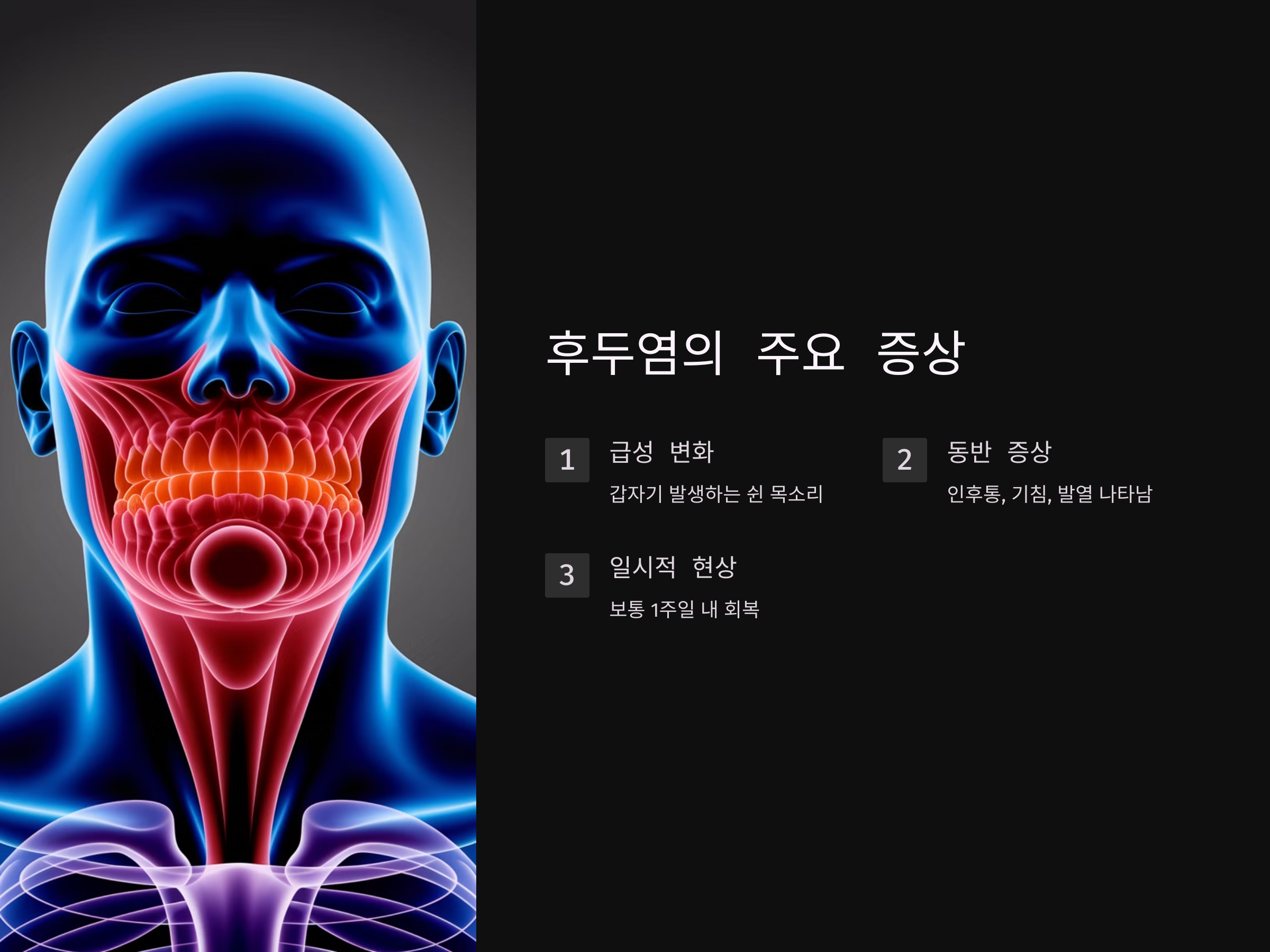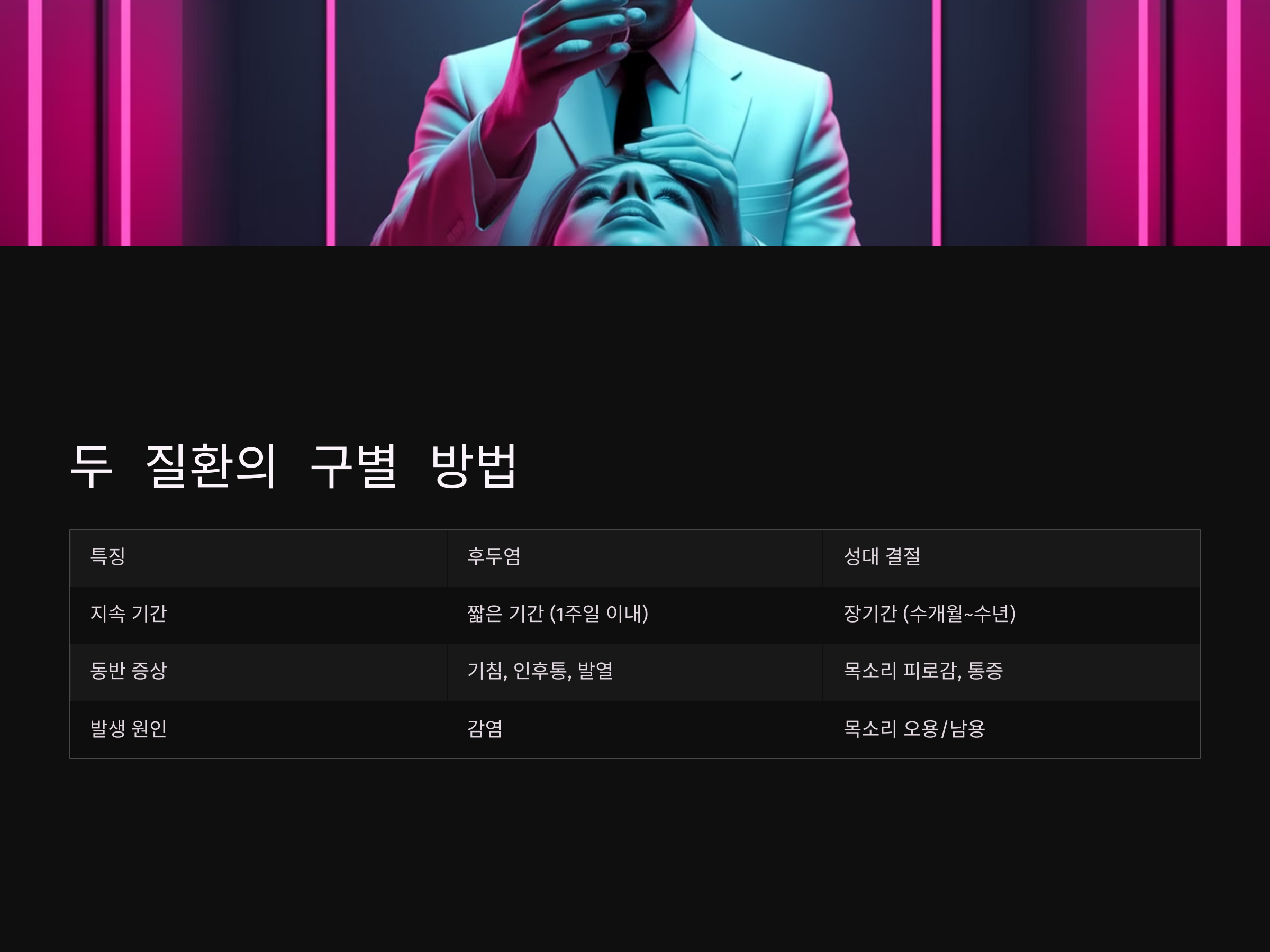 후두염의 가장 큰 특징은 급성적인 변화입니다. 보통 감기나 목 감염과 함께 나타나며, 목소리가 변하는 증상이 일시적이라는 점에서 성대 결절과 구별됩니다. 후두염이 의심되는 경우, 일반적으로 목소리의 변화가 몇 일 내로 회복됩니다. 그러나 만약 증상이 1주일 이상 지속된다면 다른 질환을 의심할 필요가 있습니다.