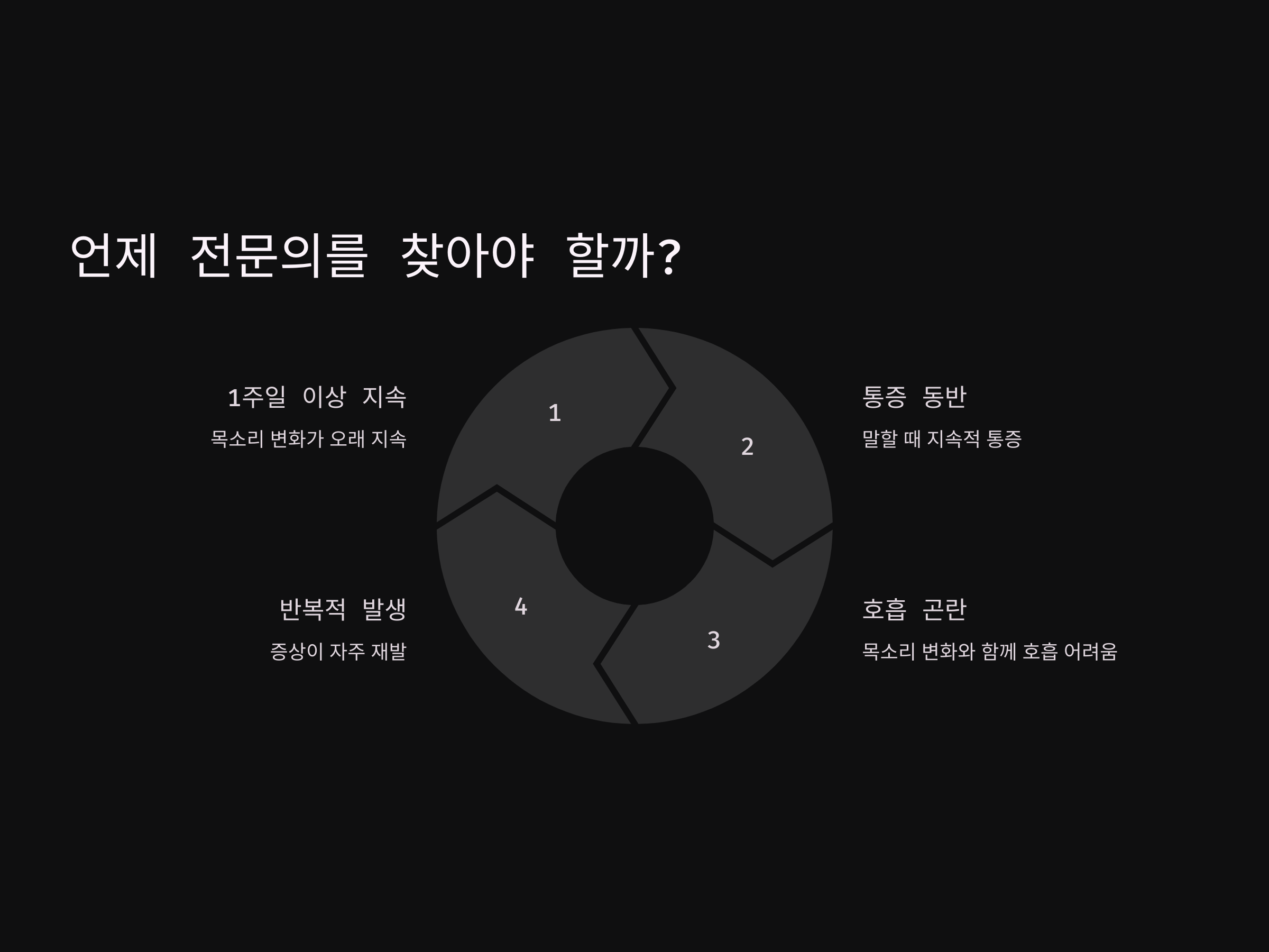 - 목소리를 낼 때 통증이나 불편함이 있을 수 있다