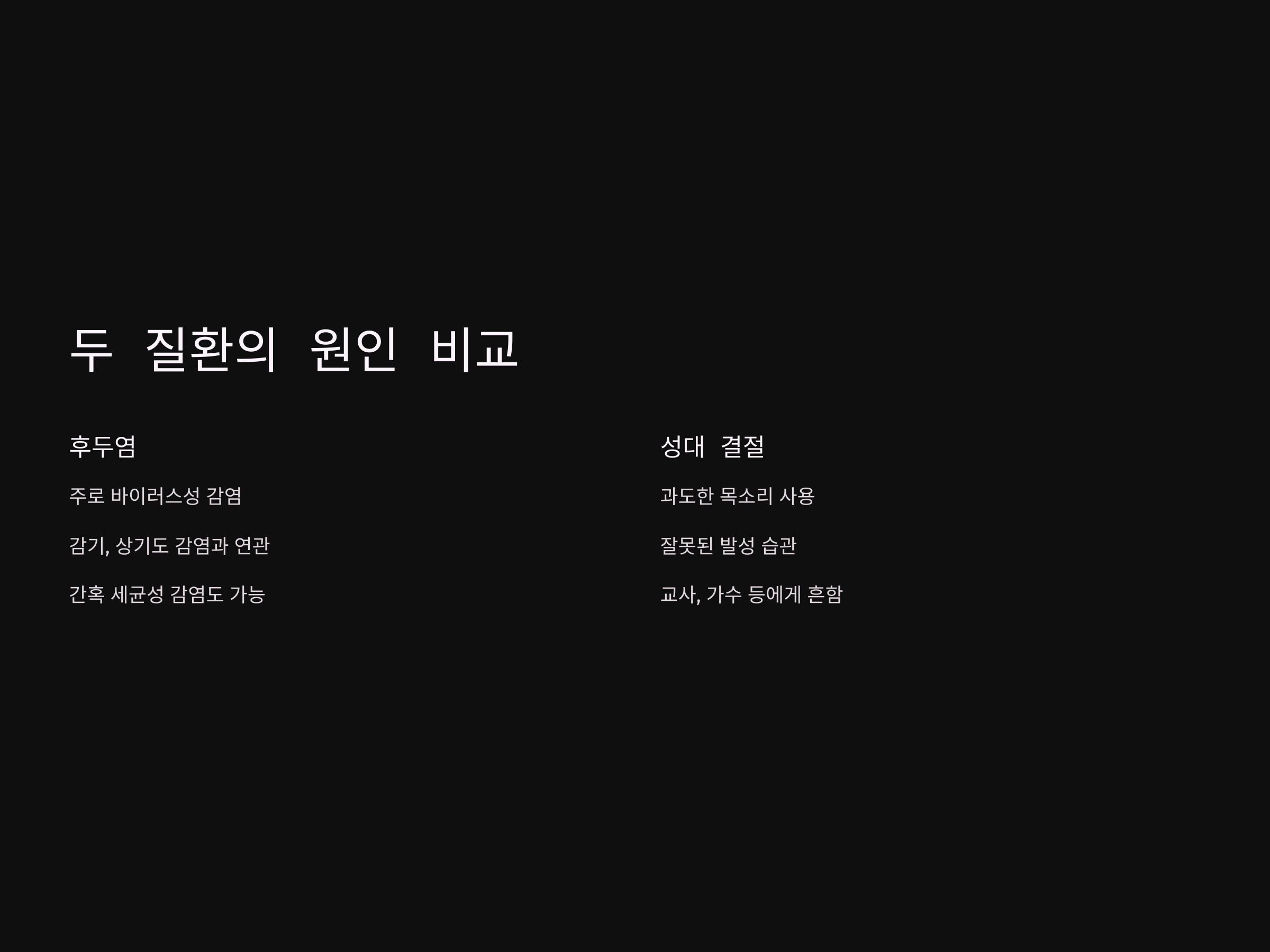 | 원인 | 바이러스성 감염, 세균 감염 | 지나치거나 잘못된 목소리 사용 |