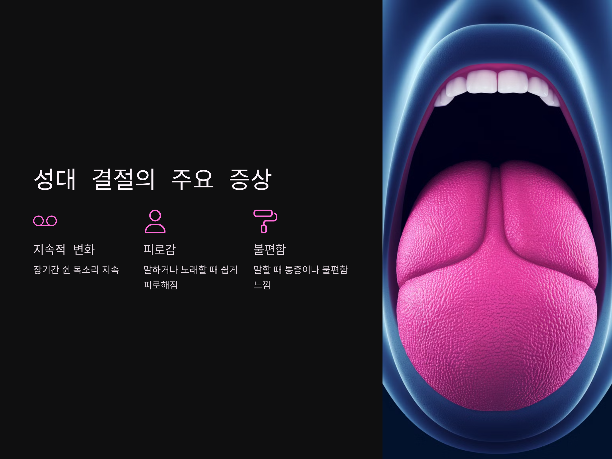 성대 결절은 성대의 점막이 반복적인 자극을 받아 두꺼워지거나 결절(혹이 생기는 현상)이 형성되는 질환입니다. 성대 결절은 주로 목소리를 많이 사용하는 사람, 예를 들어 교사, 가수, 발표자 등에게 흔하게 발생합니다. 성대 결절의 주요 증상은 지속적인 쉰 목소리와 목소리 변화입니다. 하지만 후두염과 달리, 성대 결절은 염증이 아니라 구조적인 문제로 발생하기 때문에 증상이 더 오랫동안 지속될 수 있습니다.
