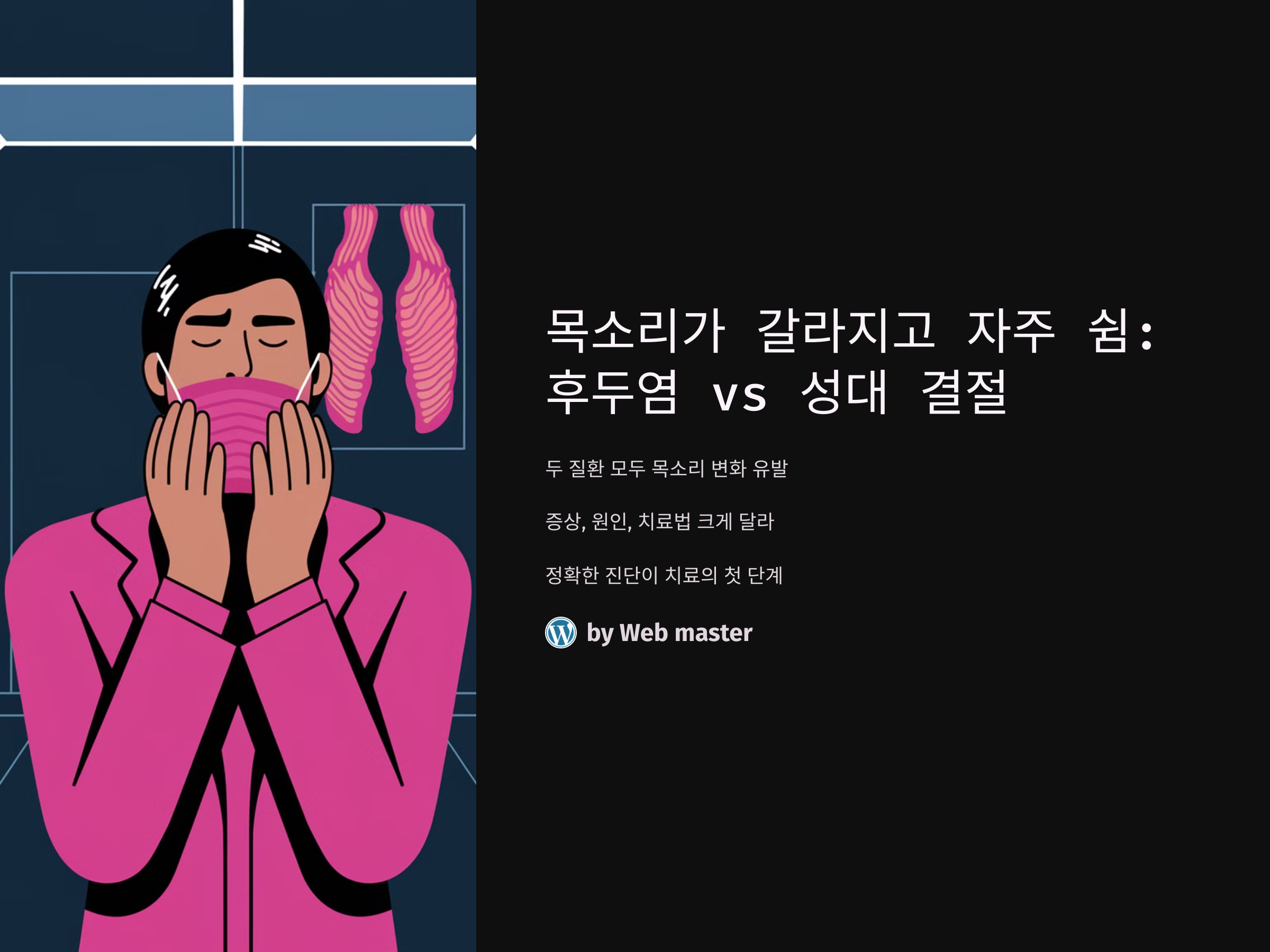 목소리가 갈라지고 자주 쉰다면, 많은 사람들이 후두염이나 성대 결절과 같은 질환을 의심할 수 있습니다. 두 질환 모두 목소리 변화와 관련이 깊지만, 증상이나 원인, 치료 방법에서 큰 차이를 보입니다. 이 포스팅에서는 후두염과 성대 결절의 차이점과 각 질환의 특징을 비교하여 어떤 질환일 가능성이 더 높은지 알아보겠습니다.