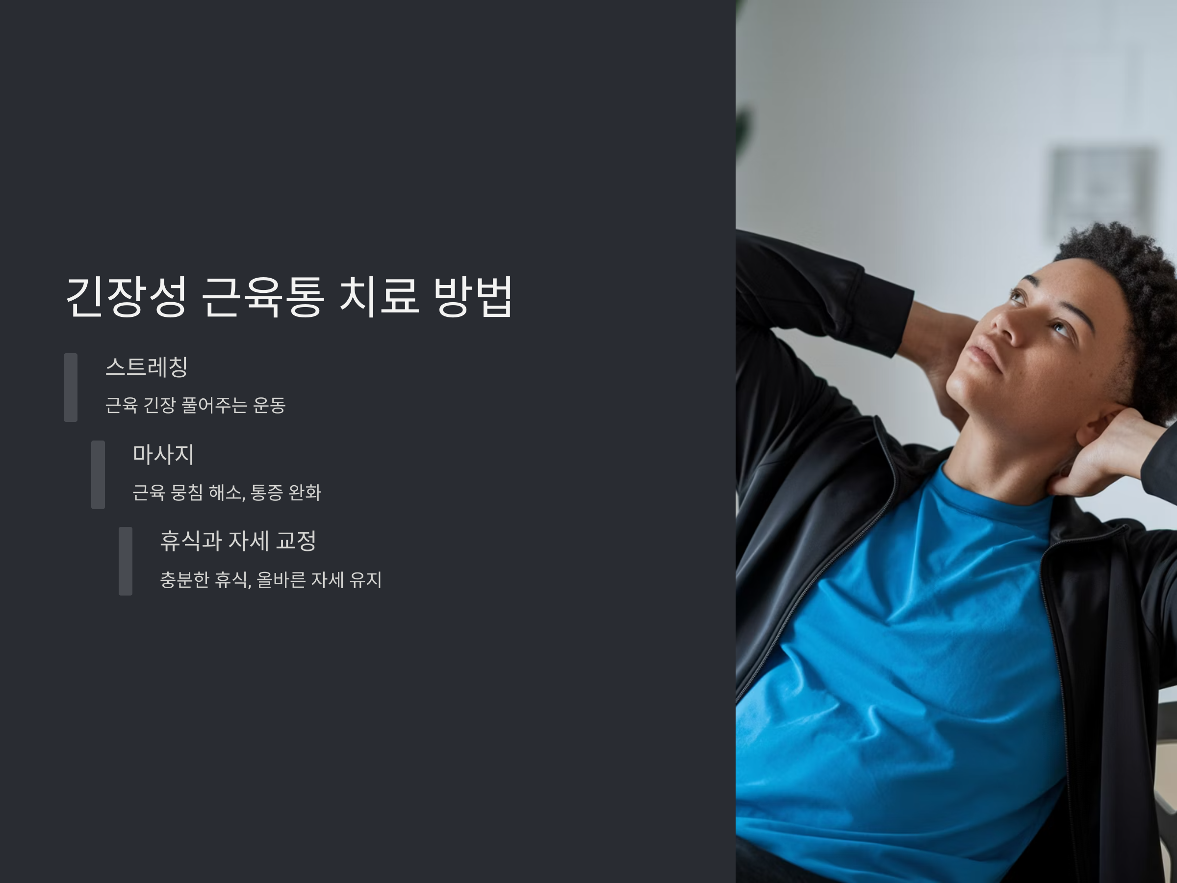 - 스트레칭: 자주 스트레칭을 해주면 근육의 긴장을 풀어줄 수 있습니다.