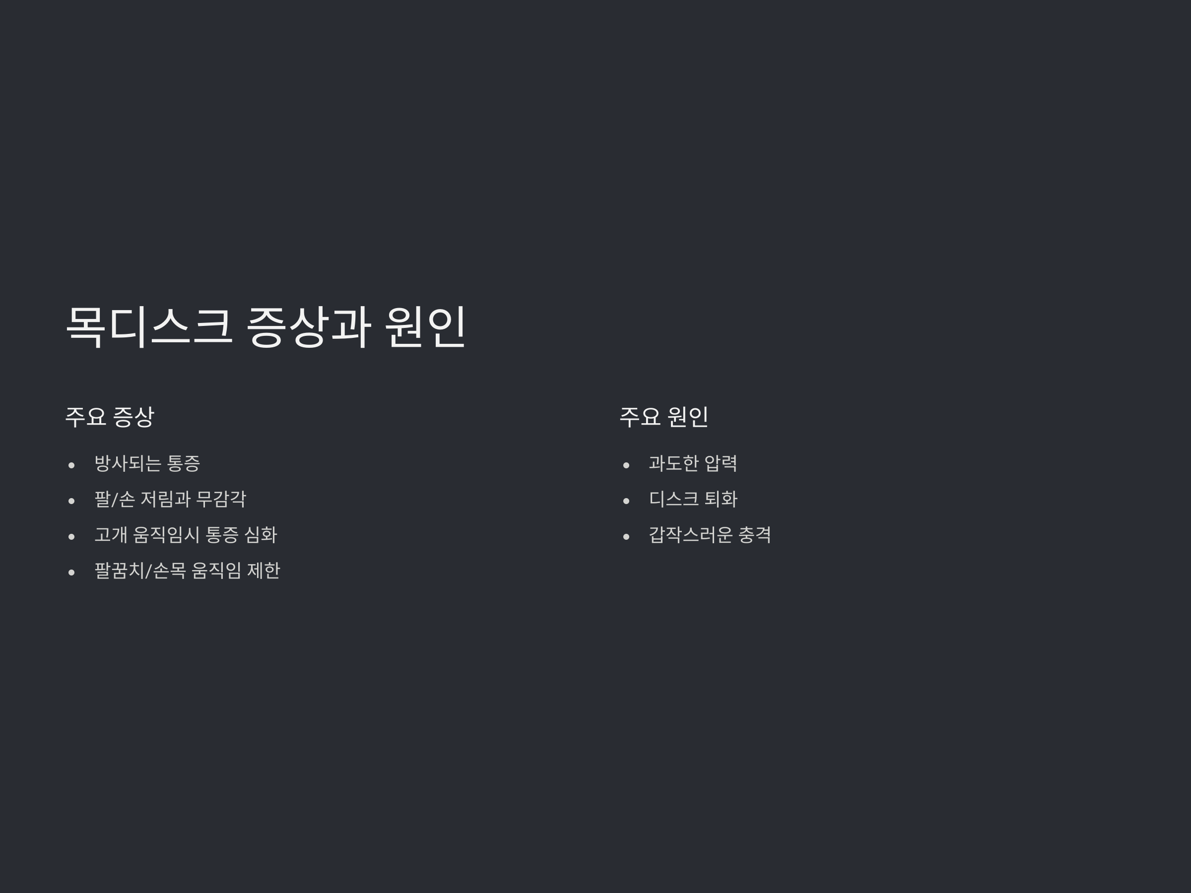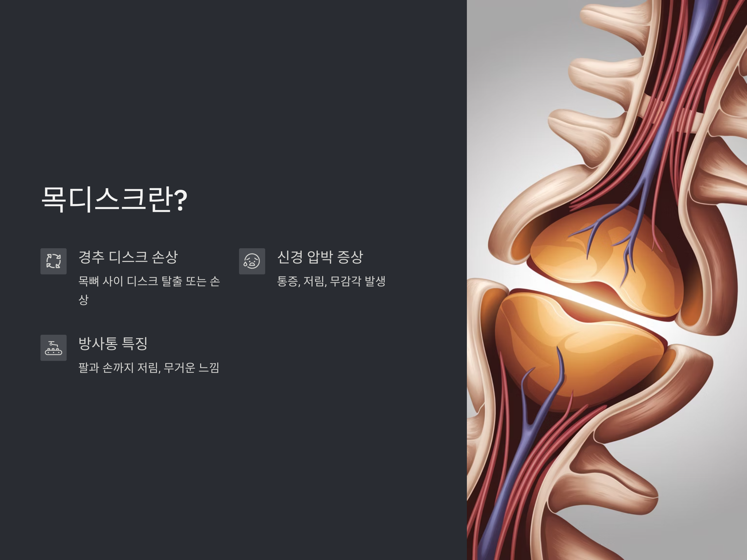 목디스크는 경추(목뼈)에 위치한 디스크가 탈출하거나 손상되는 질환입니다. 이 디스크는 목뼈 사이에서 충격을 흡수하고 유연한 움직임을 가능하게 하는 중요한 역할을 합니다. 하지만 나이가 들면서 디스크가 퇴화하거나, 잘못된 자세나 과도한 압력으로 인해 디스크가 탈출되면 신경을 압박하게 됩니다. 이로 인해 통증, 저림, 무감각 등의 증상이 나타날 수 있습니다. 특히 목 디스크가 심각하게 탈출하면 팔과 손까지 저리고, 무거운 느낌이 들 수 있습니다.
