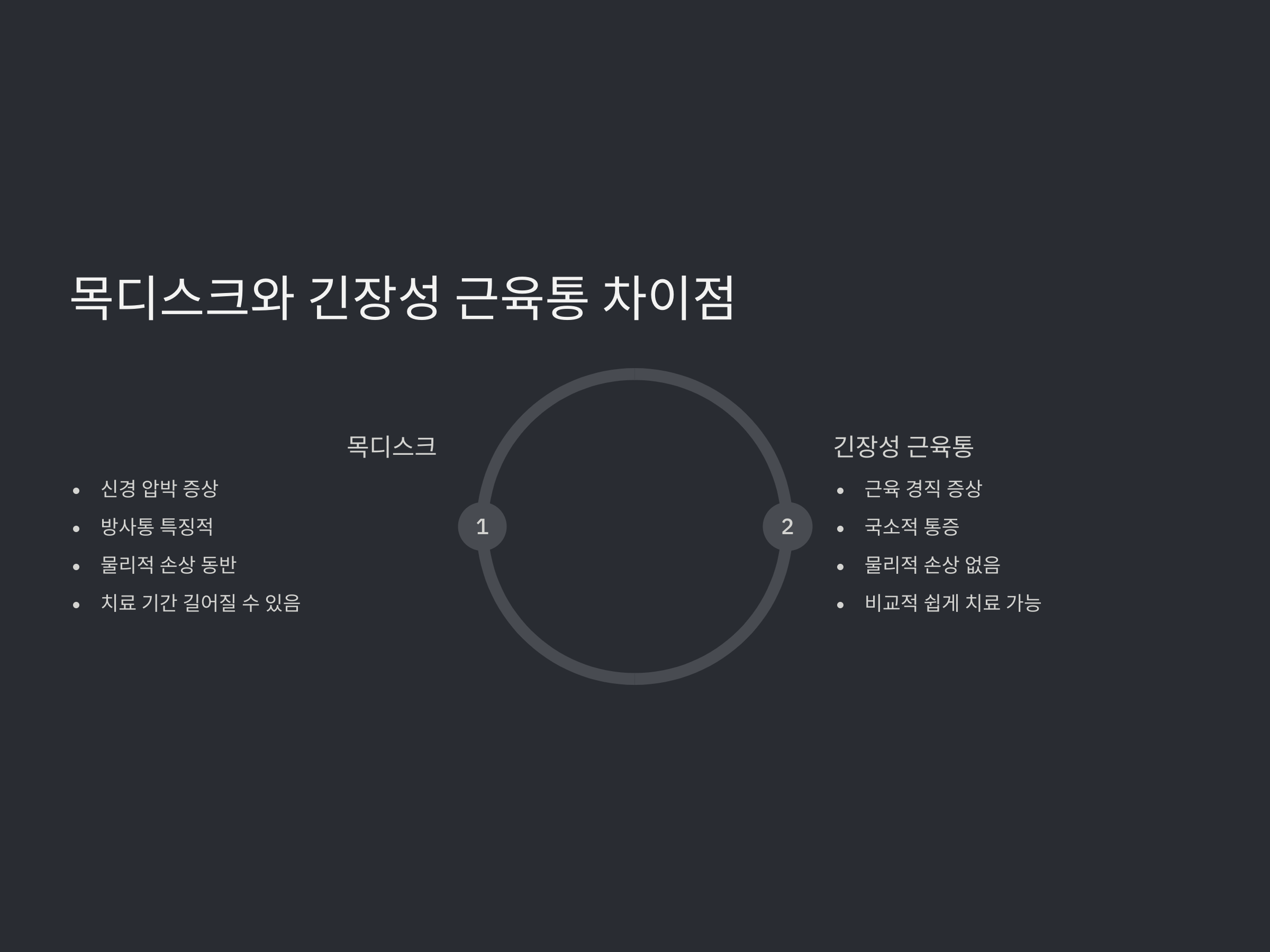 목디스크와 긴장성 근육통은 증상이 유사할 수 있지만, 중요한 차이점이 존재합니다. 목디스크는 주로 신경 압박으로 인해 팔이나 손으로 방사되는 통증과 저림이 특징적입니다. 반면 긴장성 근육통은 근육의 경직으로 인한 국소적인 통증으로, 신경 압박이나 방사되는 증상이 없다는 점이 차이점입니다. 또한, 목디스크는 물리적인 손상이 동반되기 때문에 치료에 시간이 오래 걸릴 수 있으며, 심한 경우 수술이 필요할 수도 있습니다. 그러나 긴장성 근육통은 상대적으로 간단한 물리치료나 스트레칭, 마사지 등으로 개선될 수 있습니다.