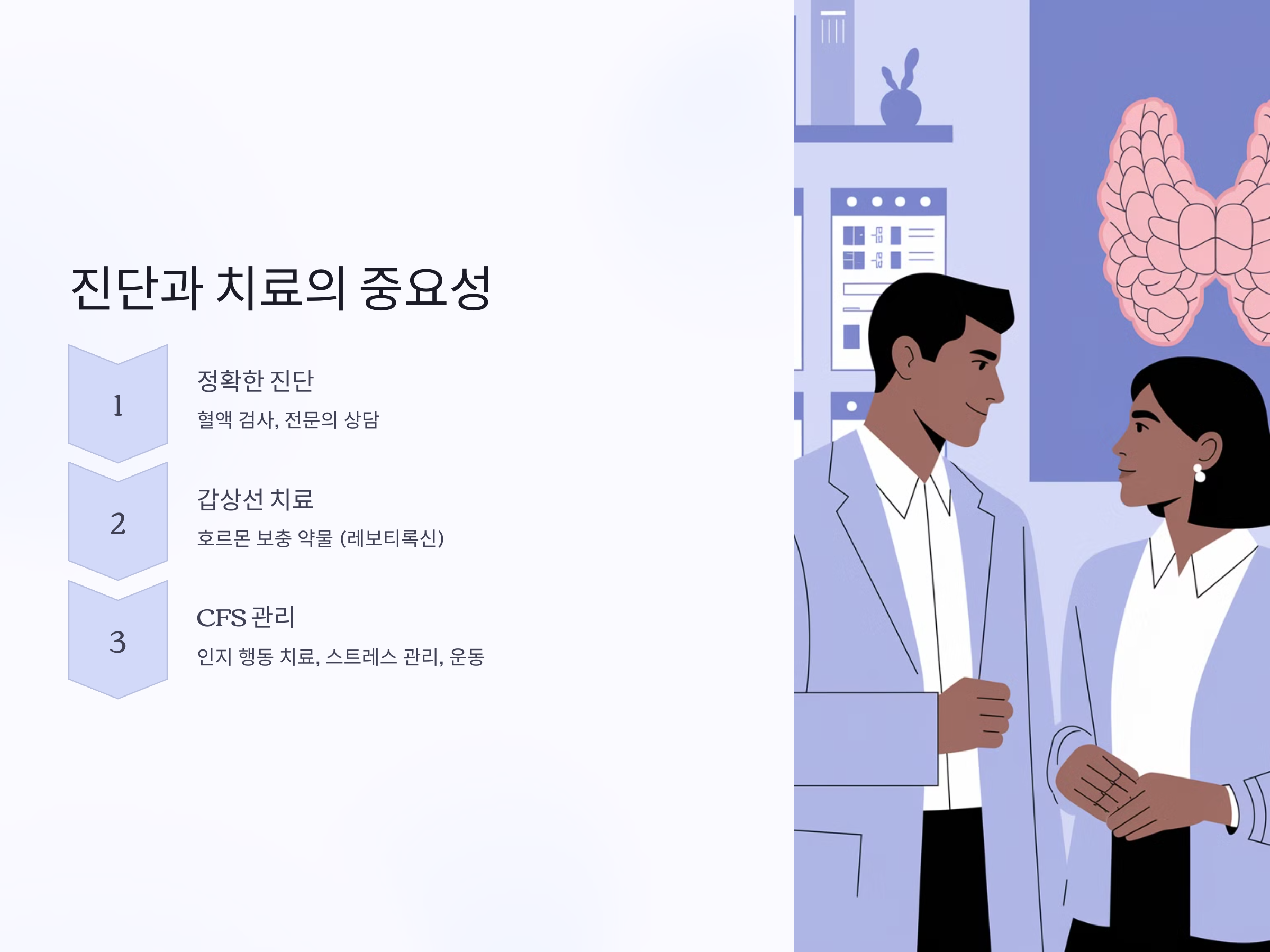 두 질환 모두 피로감을 동반하지만, 그 원인과 치료 방법이 다르기 때문에 정확한 진단을 받는 것이 중요합니다. 만약 피로감과 무기력함이 지속된다면, 혈액 검사를 통해 갑상선 기능을 체크하고, 필요시 내과 전문의와 상담하는 것이 좋습니다. 또한, 만성 피로 증후군이라면 심리적인 스트레스와 생활 습관을 점검하고, 필요시 정신건강 전문가의 도움을 받는 것이 도움이 될 수 있습니다.