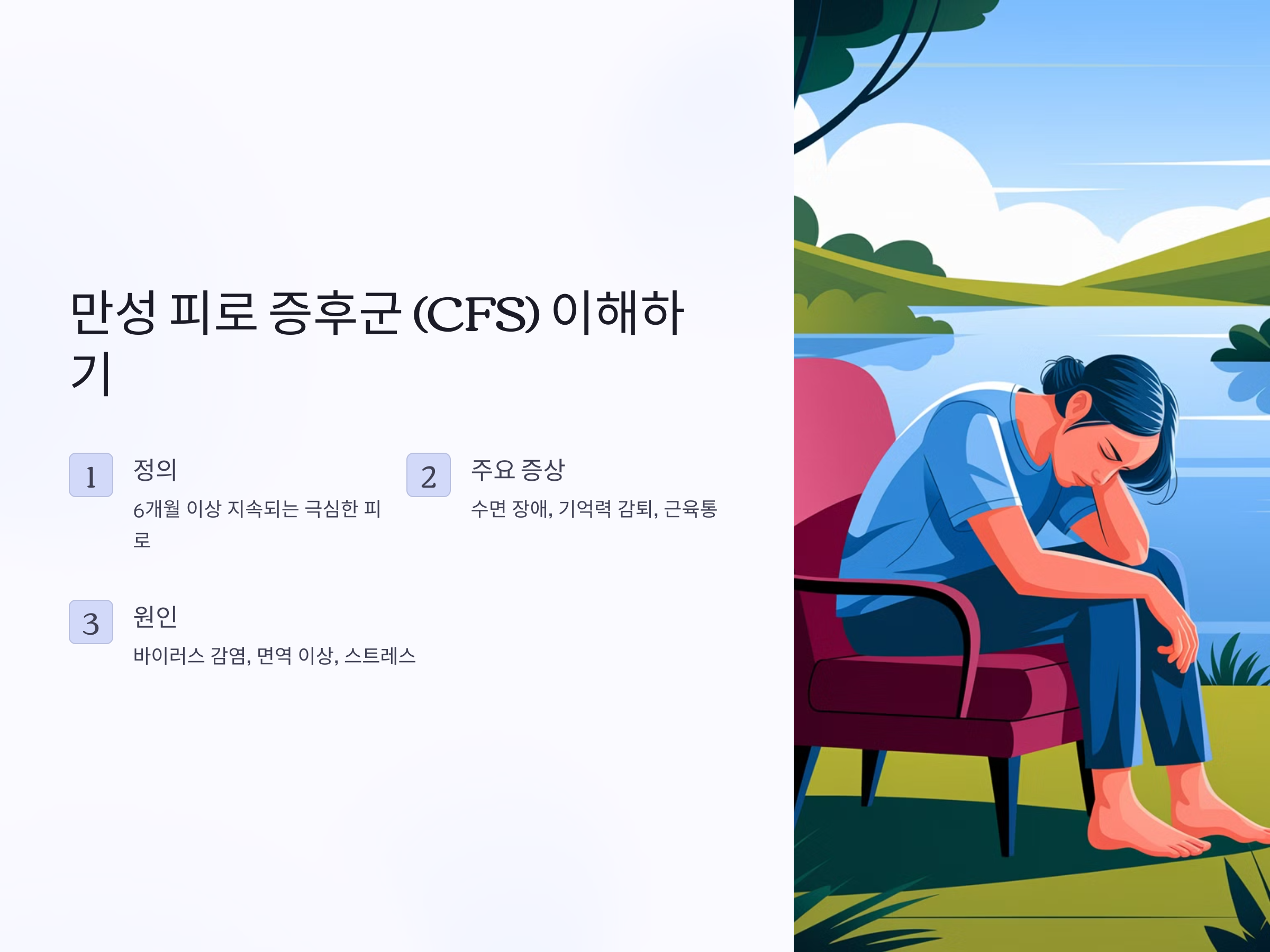 만성 피로 증후군(CFS, Chronic Fatigue Syndrome)은 주기적으로 극심한 피로와 무기력감을 동반하는 질환으로, 이 피로가 6개월 이상 지속되는 경우 진단됩니다. 단순한 피로와는 달리, 만성 피로 증후군은 충분한 휴식을 취해도 피로가 풀리지 않으며, 일상적인 활동을 수행하기 어려울 정도로 체력과 정신적 에너지가 고갈됩니다. 주요 증상으로는 수면 장애, 기억력 감퇴, 집중력 저하, 근육통 및 관절통 등이 있습니다.
