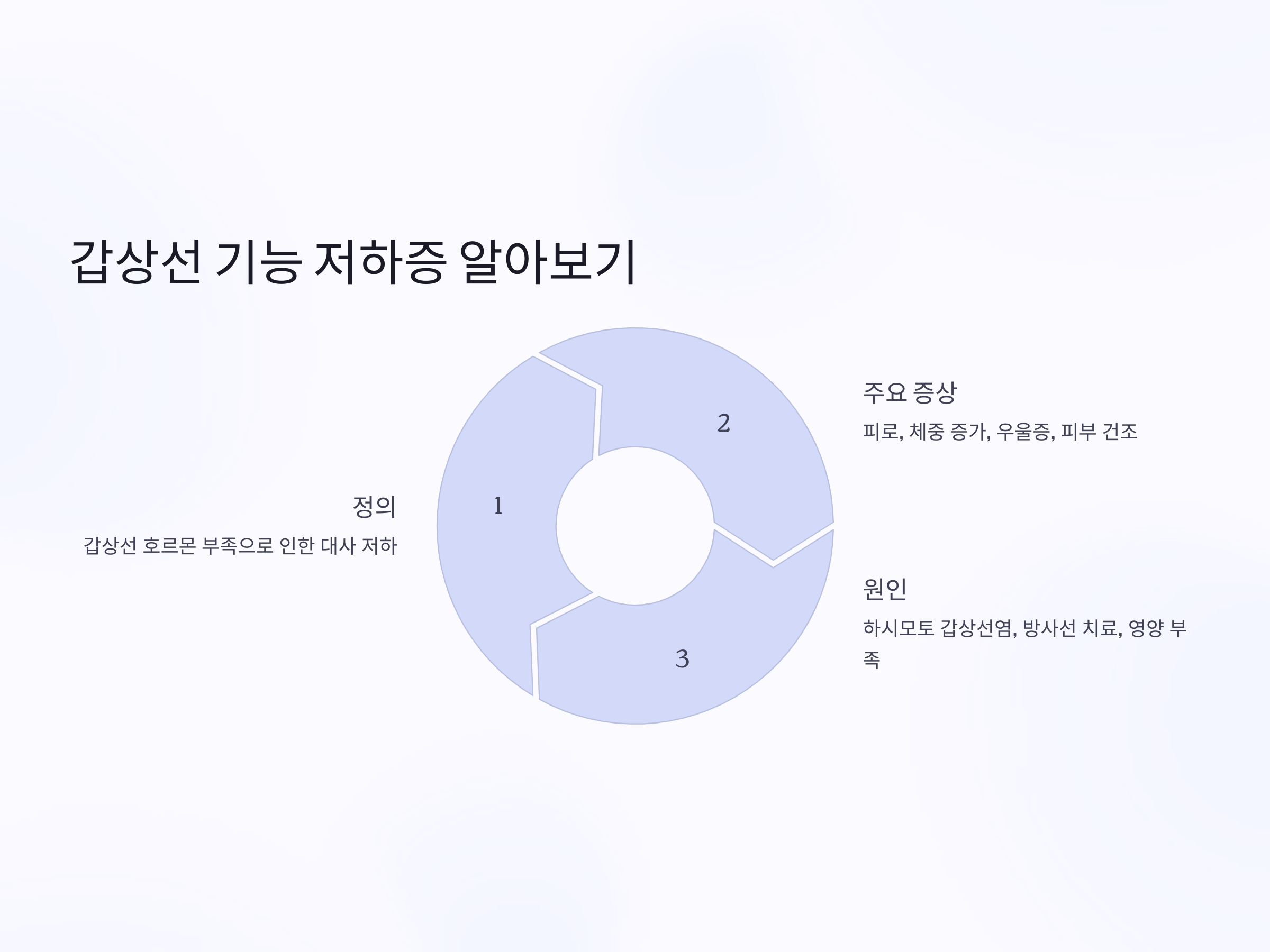 갑상선 기능 저하증(甲狀腺機能低下症, Hypothyroidism)은 갑상선 호르몬이 부족하여 신체의 여러 기능이 저하되는 질환입니다. 갑상선 호르몬은 체내 에너지 생산과 대사에 중요한 역할을 하기 때문에, 이 호르몬이 부족하면 피로감, 체중 증가, 우울증, 피부 건조, 추위에 민감해지는 등의 증상이 나타날 수 있습니다.