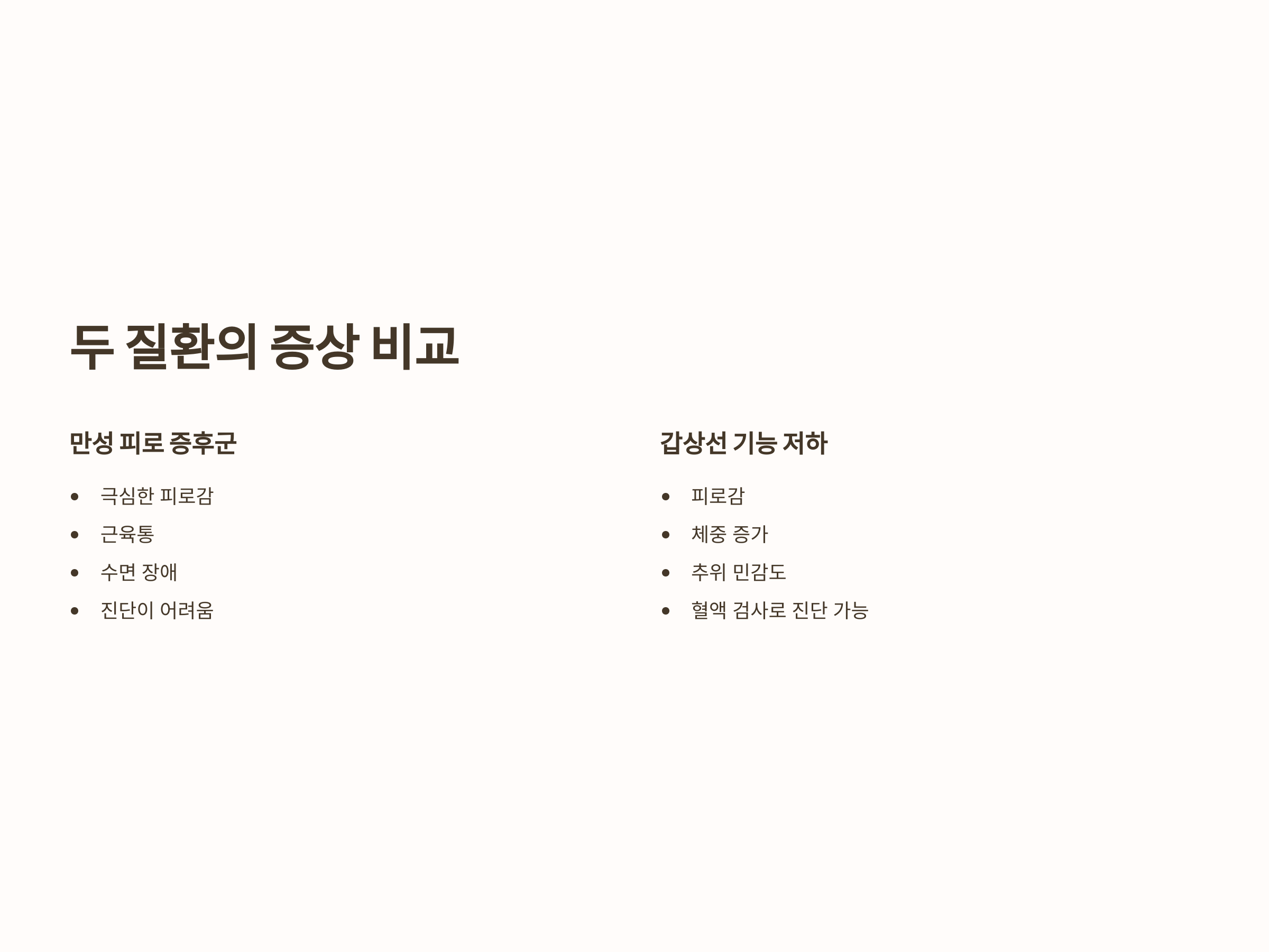 두 질환 모두 피로감을 유발하지만, 갑상선 기능 저하증은 혈액 검사를 통해 진단할 수 있어 더 정확한 진단이 가능합니다. 반면 만성 피로 증후군은 그 원인이 명확하지 않기 때문에 진단이 어려울 수 있으며, 치료는 증상 완화에 중점을 두고 이루어집니다.