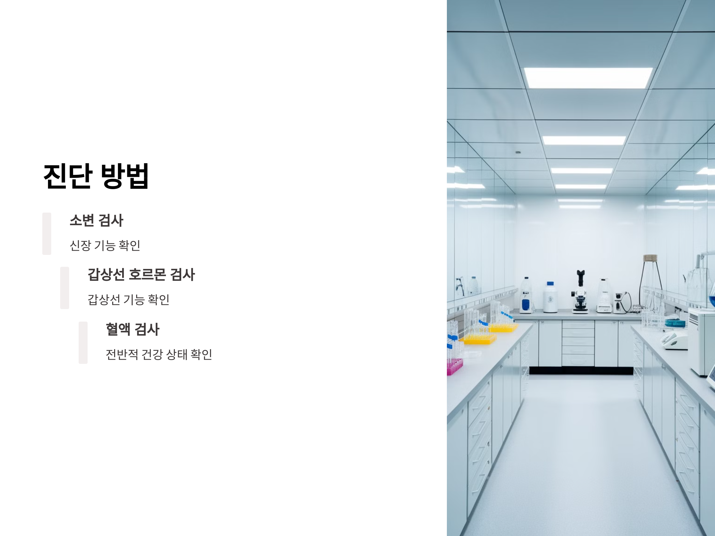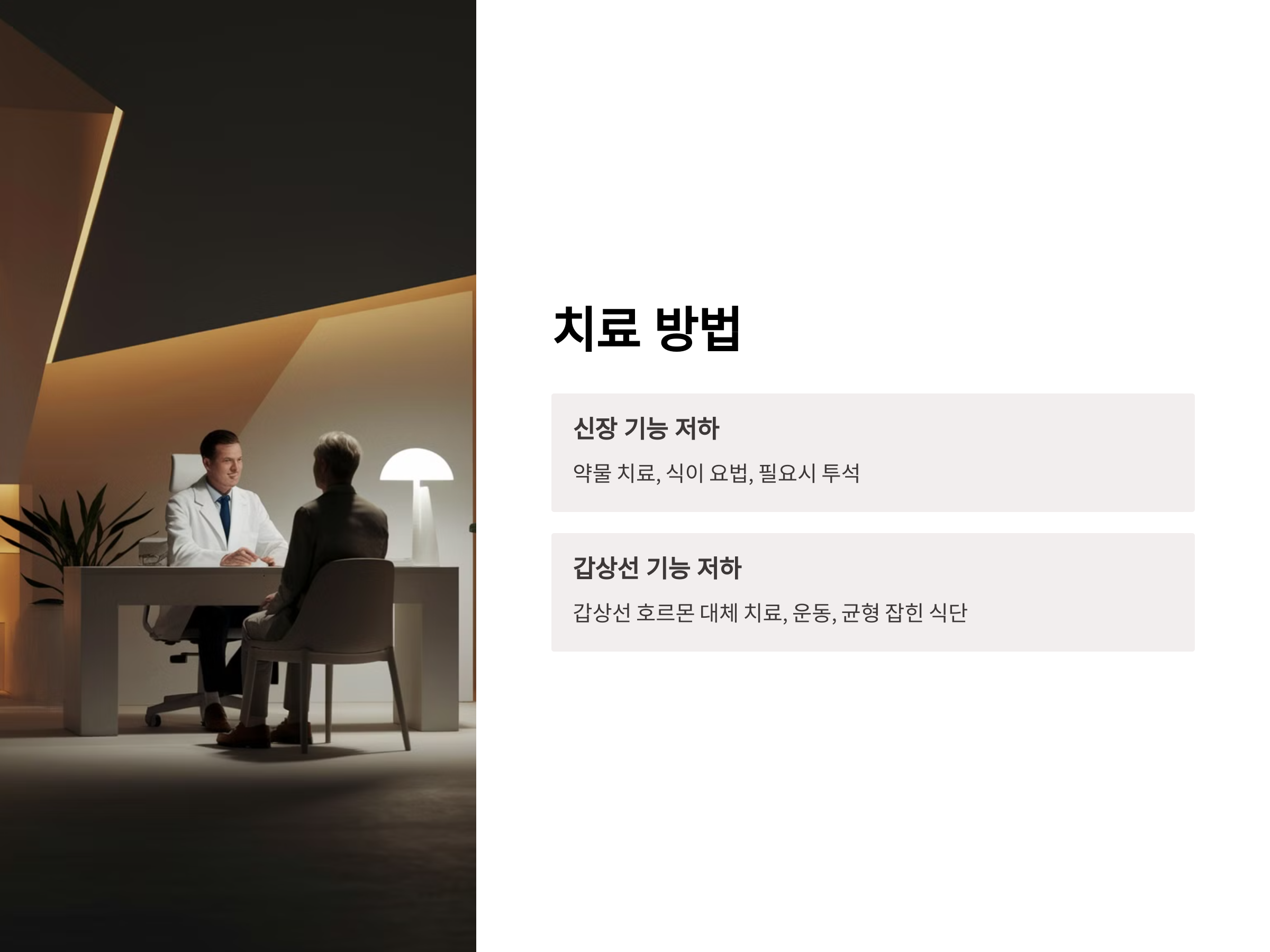 따라서 두 가지 질환을 구별하기 위해서는 소변 검사, 갑상선 호르몬 검사, 혈액 검사 등을 통해 정확한 진단을 받는 것이 중요합니다. 신장 기능과 갑상선 기능 모두 우리 몸에 중요한 영향을 미치기 때문에, 증상이 지속되면 전문가의 상담을 받는 것이 필수적입니다.