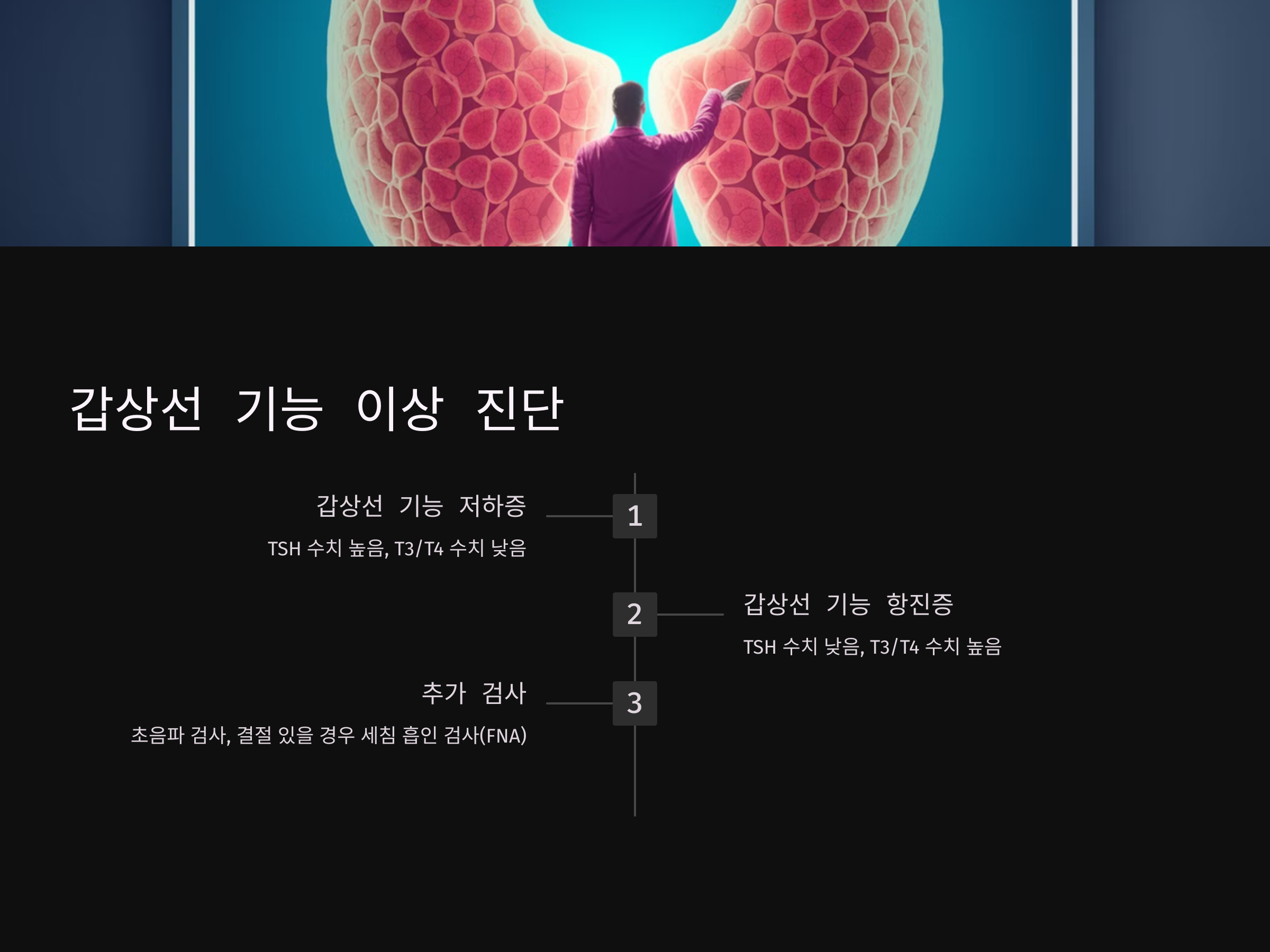 갑상선 기능 이상은 갑상선 호르몬의 분비 상태에 따라 두 가지 주요 유형이 나뉩니다. 갑상선 기능 저하증과 갑상선 기능 항진증이 그것입니다. 갑상선 호르몬 수치를 확인하기 위해 TSH(갑상선 자극 호르몬), T3, T4 수치를 측정하는 혈액 검사를 시행합니다. 갑상선 기능 저하증은 TSH 수치가 높고, T3, T4 수치는 낮게 나타납니다. 반면, 갑상선 기능 항진증은 TSH 수치가 낮고, T3, T4 수치는 높은 결과를 보입니다.