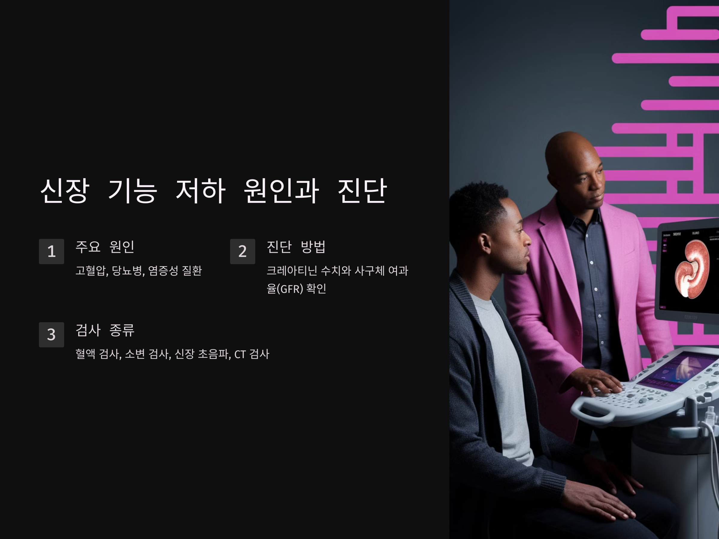 신장 기능 저하의 주요 원인으로는 고혈압, 당뇨병, 염증성 질환 등이 있습니다. 이러한 질환들이 신장에 부담을 주어, 결국 신장 기능이 저하될 수 있습니다. 신장 기능이 저하되면, 크레아티닌 수치와 사구체 여과율(GFR)을 통해 진단할 수 있습니다. 혈액 검사와 소변 검사를 통해 신장 기능을 평가하고, 신장 초음파나 CT 등 다양한 영상 검사를 통해 신장 상태를 확인할 수 있습니다.