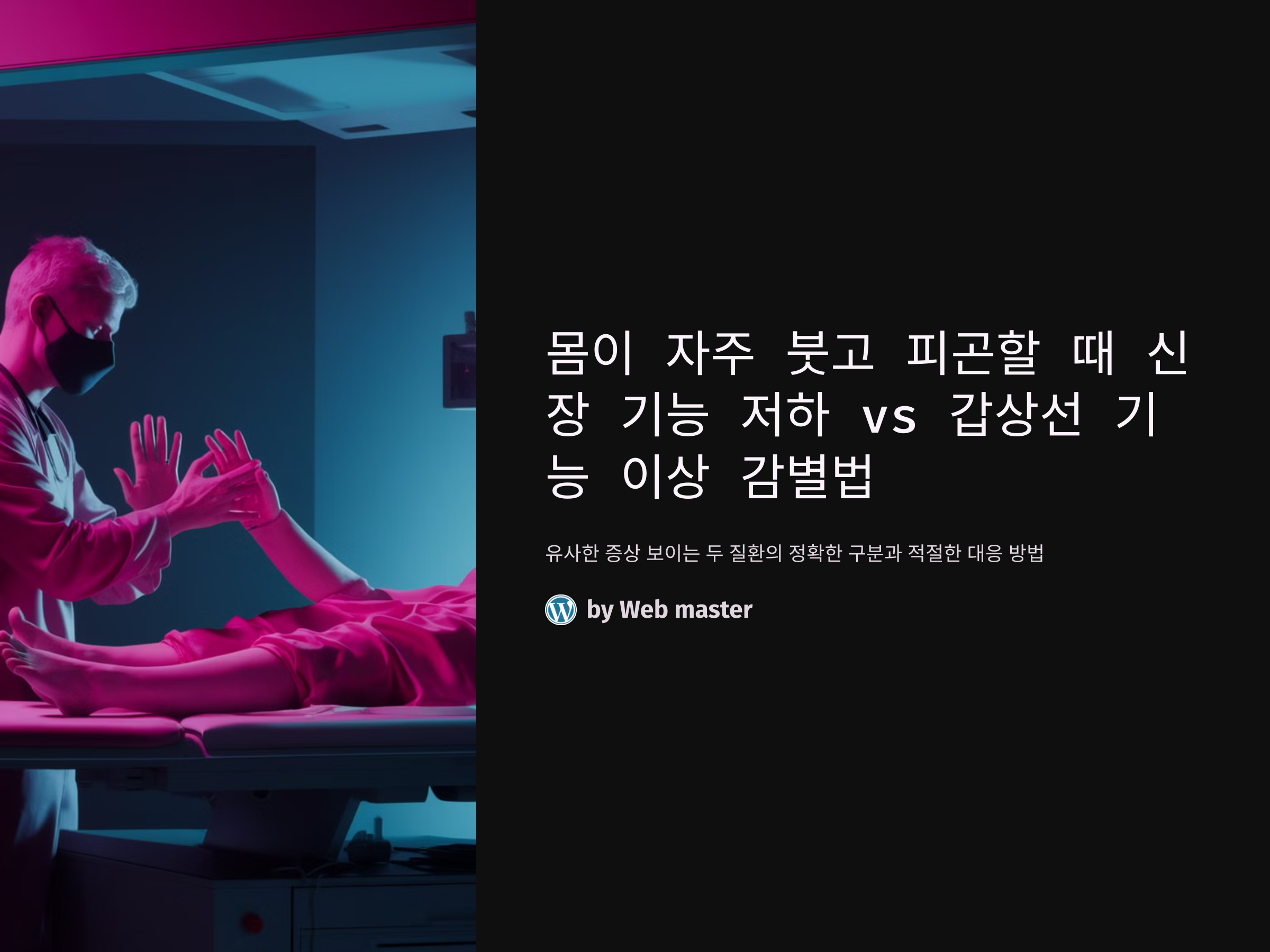 몸이 붓고 피곤한 증상은 신장 기능 저하와 갑상선 기능 이상 외에도 다른 원인들이 있을 수 있습니다. 이 글을 통해 두 질환의 차이를 명확히 구분하고, 적절한 대응 방법을 찾을 수 있도록 도와드리겠습니다. 신장 기능 저하와 갑상선 기능 이상이 어떻게 다른지, 그리고 이를 구별하는 방법에 대해 알아보겠습니다.
