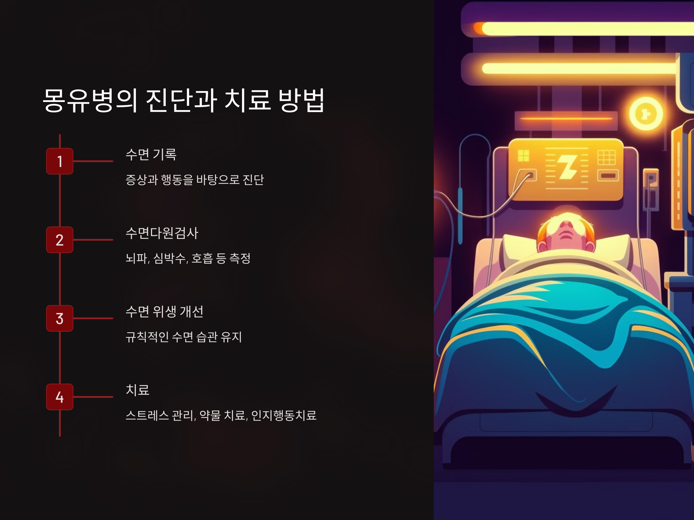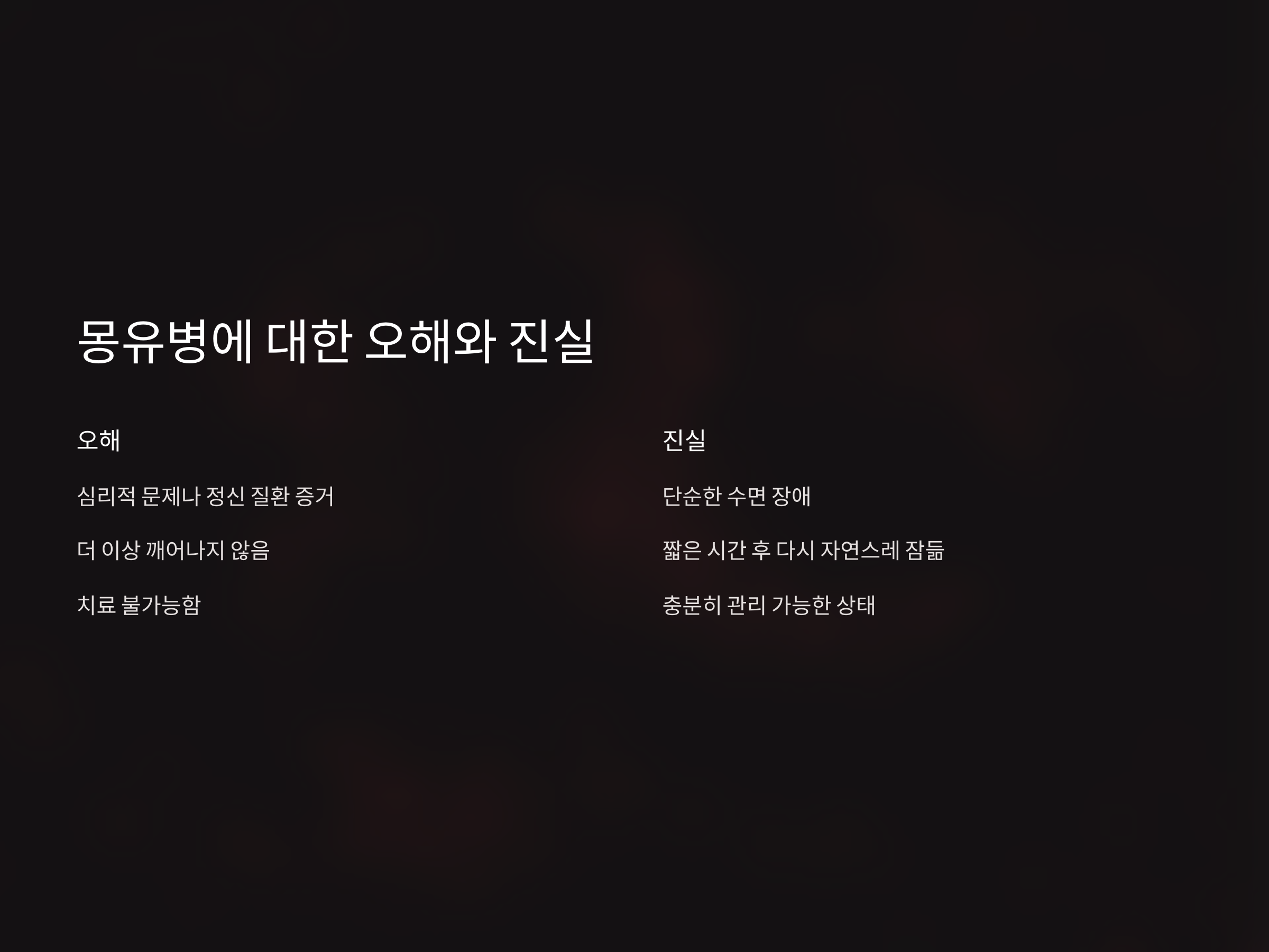 - 수면 위생 개선: 규칙적인 수면 습관을 만들고, 수면 환경을 편안하게 유지하는 것이 중요합니다. 이를 통해 수면의 질을 높여 몽유병 증상을 완화할 수 있습니다.