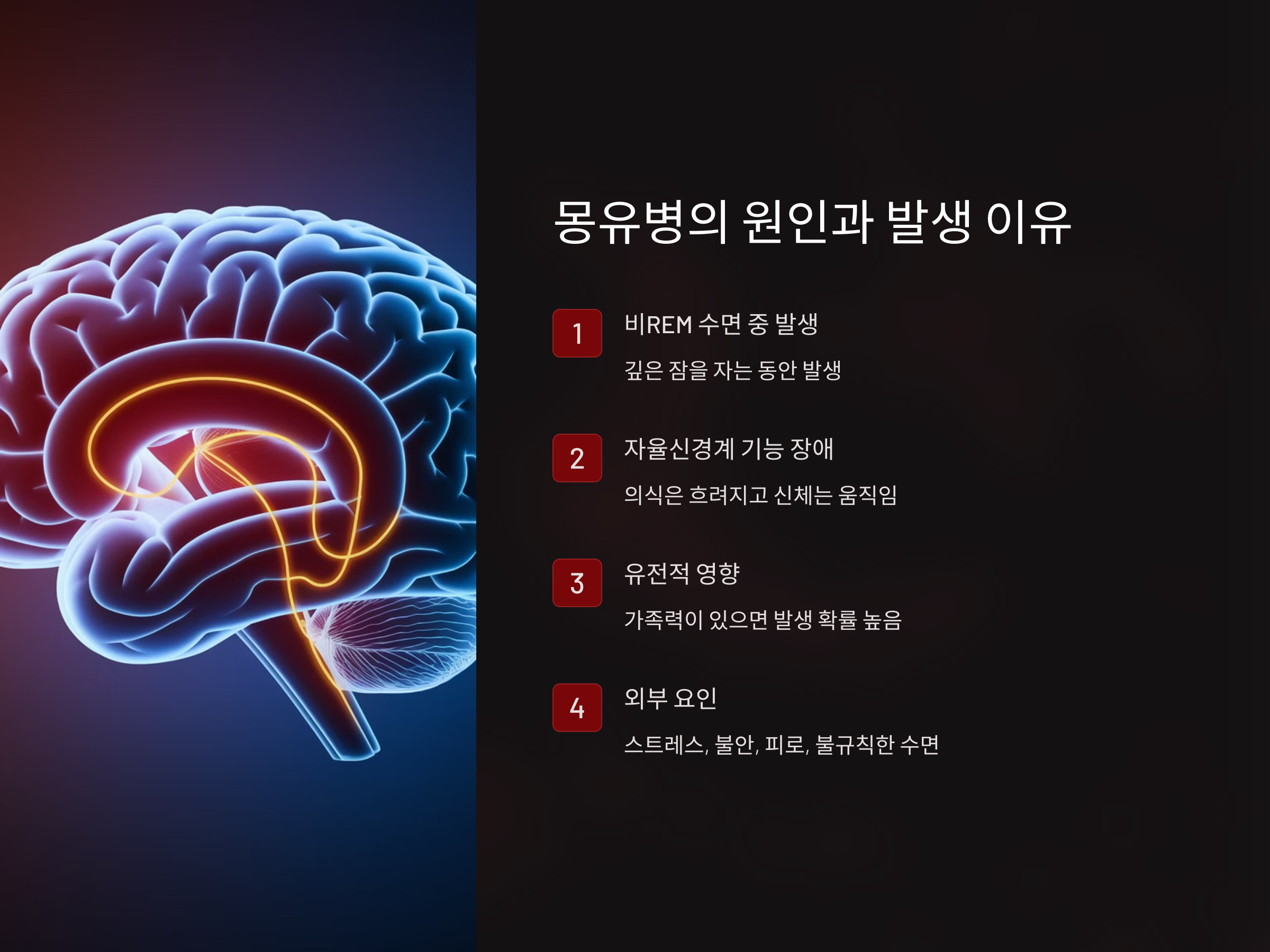 몽유병의 정확한 원인은 아직까지 완전히 밝혀지지 않았습니다. 그러나 여러 가지 연구 결과에 따르면 몽유병은 뇌의 수면 중 특정 단계에서 발생한다고 알려져 있습니다. 우리가 잠을 자는 동안 뇌는 여러 단계의 수면 상태를 거칩니다. 그 중에서도 빠른 눈 운동(REM) 수면과 비REM 수면이 중요한 역할을 합니다. 몽유병은 주로 비REM 수면 중, 특히 깊은 잠을 자는 동안 발생합니다.