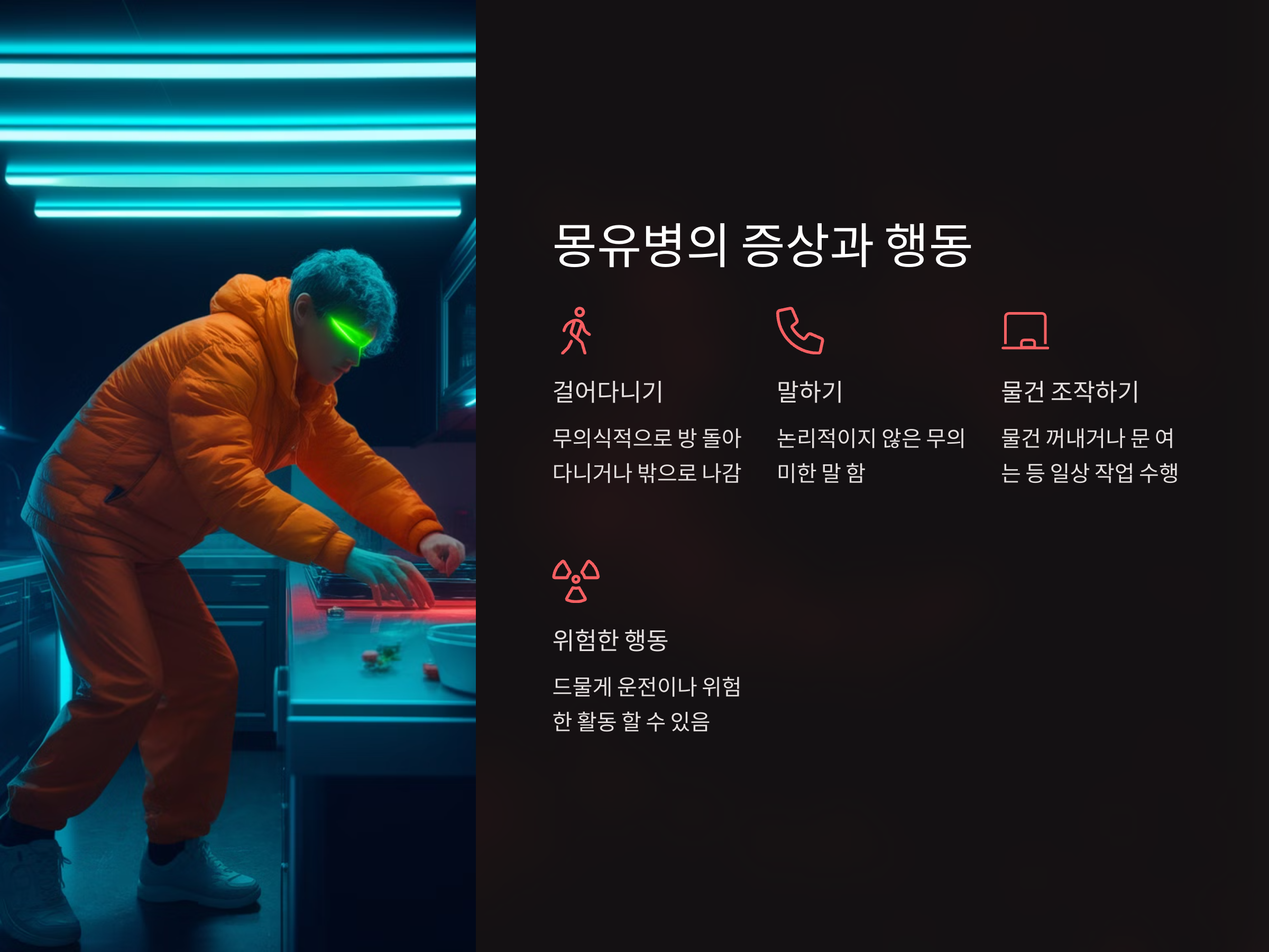 비REM 수면 단계는 뇌의 활동이 낮고, 몸은 전혀 움직이지 않으며 깊은 휴식을 취하는 시간입니다. 이때 뇌가 일시적으로 '잠이 든 상태'에서 깨어나지 않으면, 신체가 무의식적으로 움직일 수 있습니다. 몽유병은 뇌의 자율신경계가 제대로 작동하지 않으면서, 의식은 흐려지고 신체는 움직이는 상태로 나타날 수 있습니다.