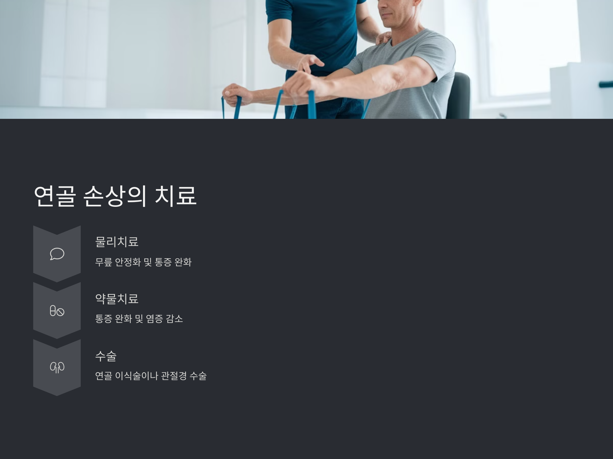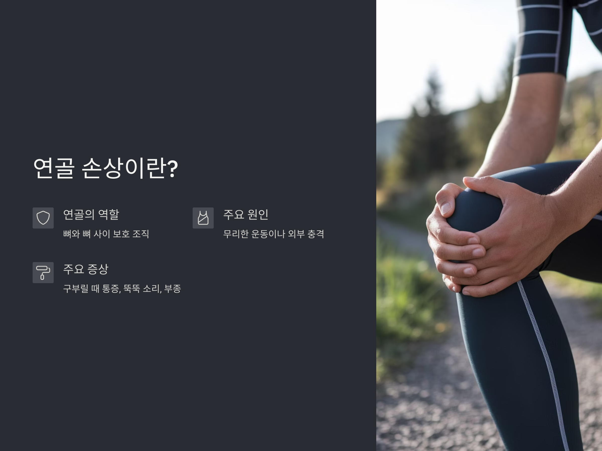 - 수술: 연골 손상이 심한 경우, 연골 이식술이나 관절경 수술을 통해 손상된 부위를 치료할 수 있습니다.
