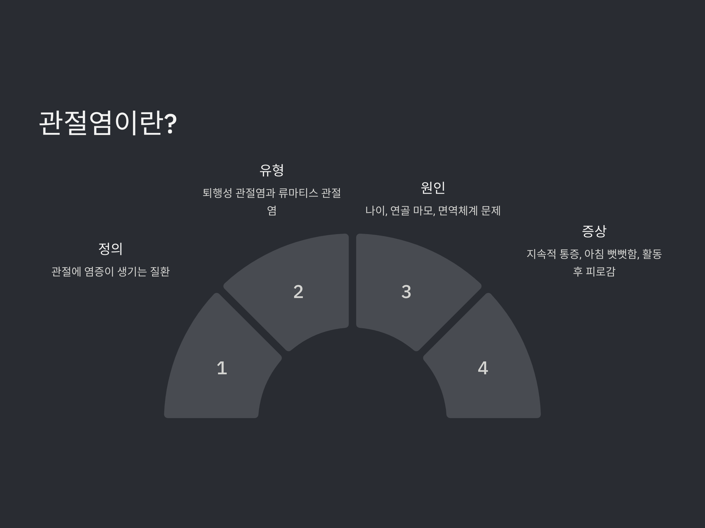 관절염은 연골 손상과 달리 주로 염증이 원인입니다. 관절염은 점차적으로 진행되며, 특별한 치료 없이 방치할 경우 무릎의 기능이 크게 제한될 수 있습니다. 치료는 약물치료, 물리치료, 심할 경우에는 수술적 치료가 필요할 수 있습니다.