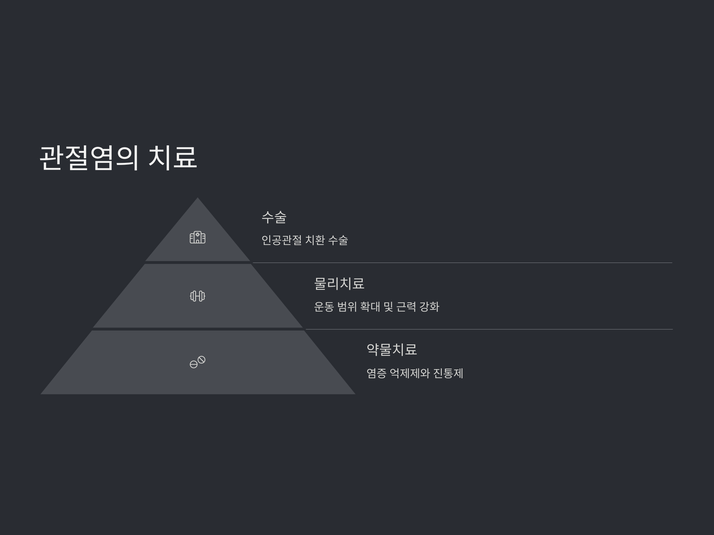 - 약물치료: 관절염의 염증을 억제하는 약물이나 진통제를 사용하여 통증을 완화합니다.