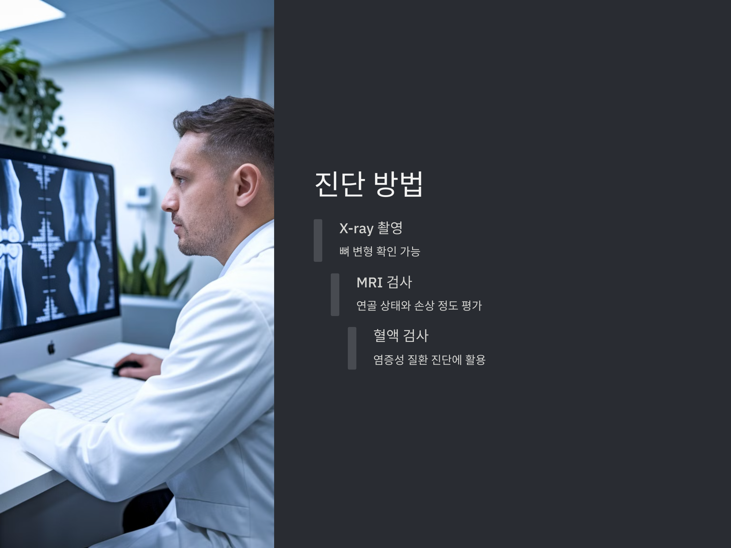 - 연골 손상이나 관절 내부의 염증을 보다 정확하게 파악할 수 있는 검사입니다. MRI를 통해 연골 상태를 확인하고, 손상 정도를 평가할 수 있습니다.