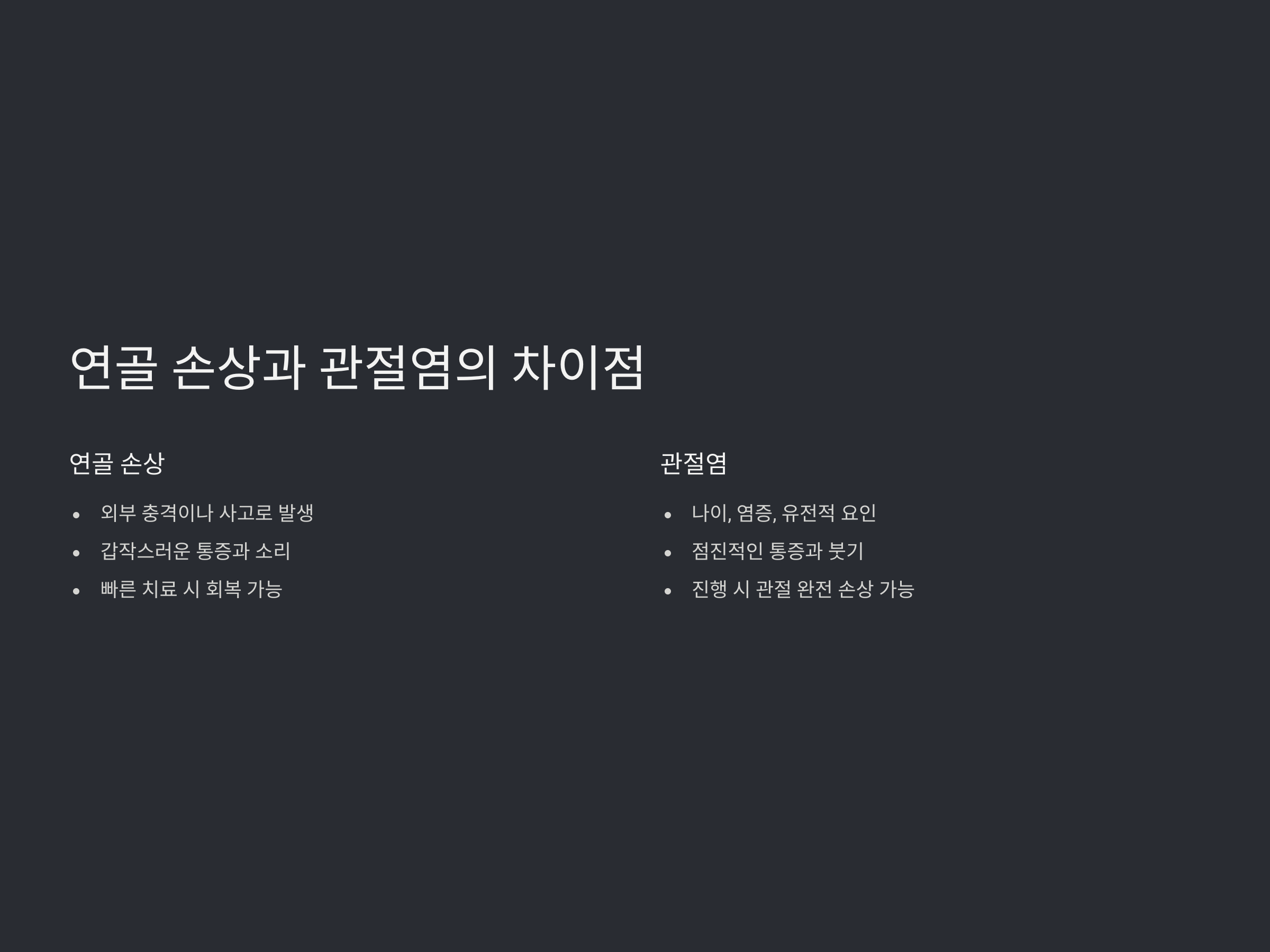연골 손상과 관절염은 치료법이 다릅니다. 각 질환에 맞는 적절한 치료를 받는 것이 중요합니다.