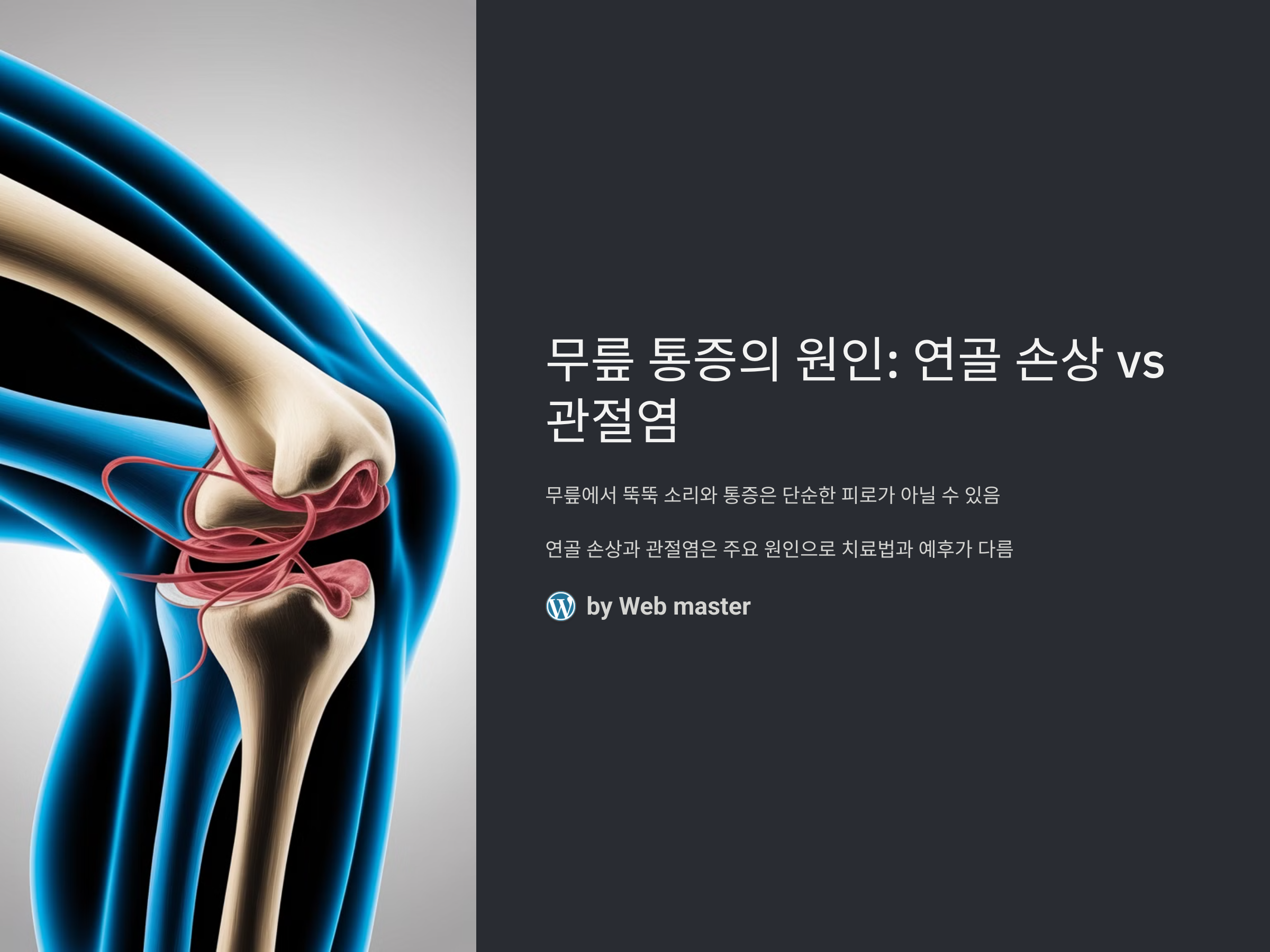 무릎에서 뚝뚝 소리가 나고 통증이 심하다면, 이는 단순한 피로의 문제가 아닐 수 있습니다. 특히, 연골 손상과 관절염은 두 가지 주요 원인으로 여겨지며, 각각의 질환은 치료법과 예후가 다릅니다. 이 포스팅에서는 무릎 통증의 원인으로 가장 흔한 두 가지인 연골 손상과 관절염에 대해 자세히 알아보겠습니다. 각 질환의 특징과 차이를 구별할 수 있는 방법을 알려드리고, 이를 바탕으로 적절한 대응 방법을 제시하겠습니다.