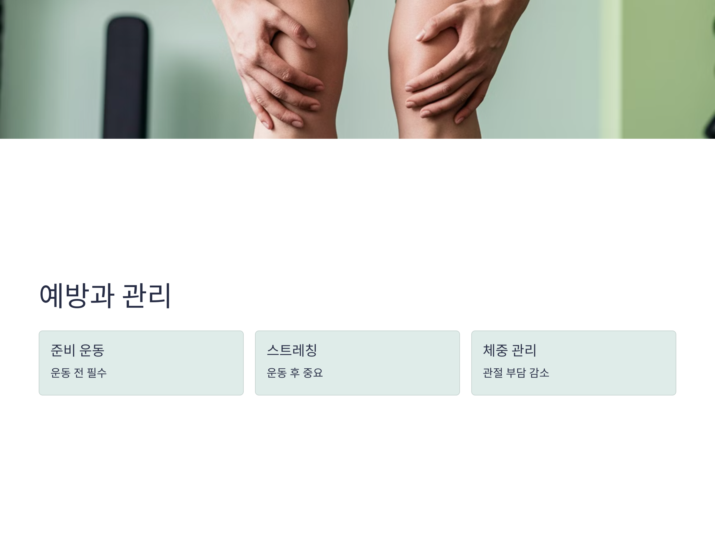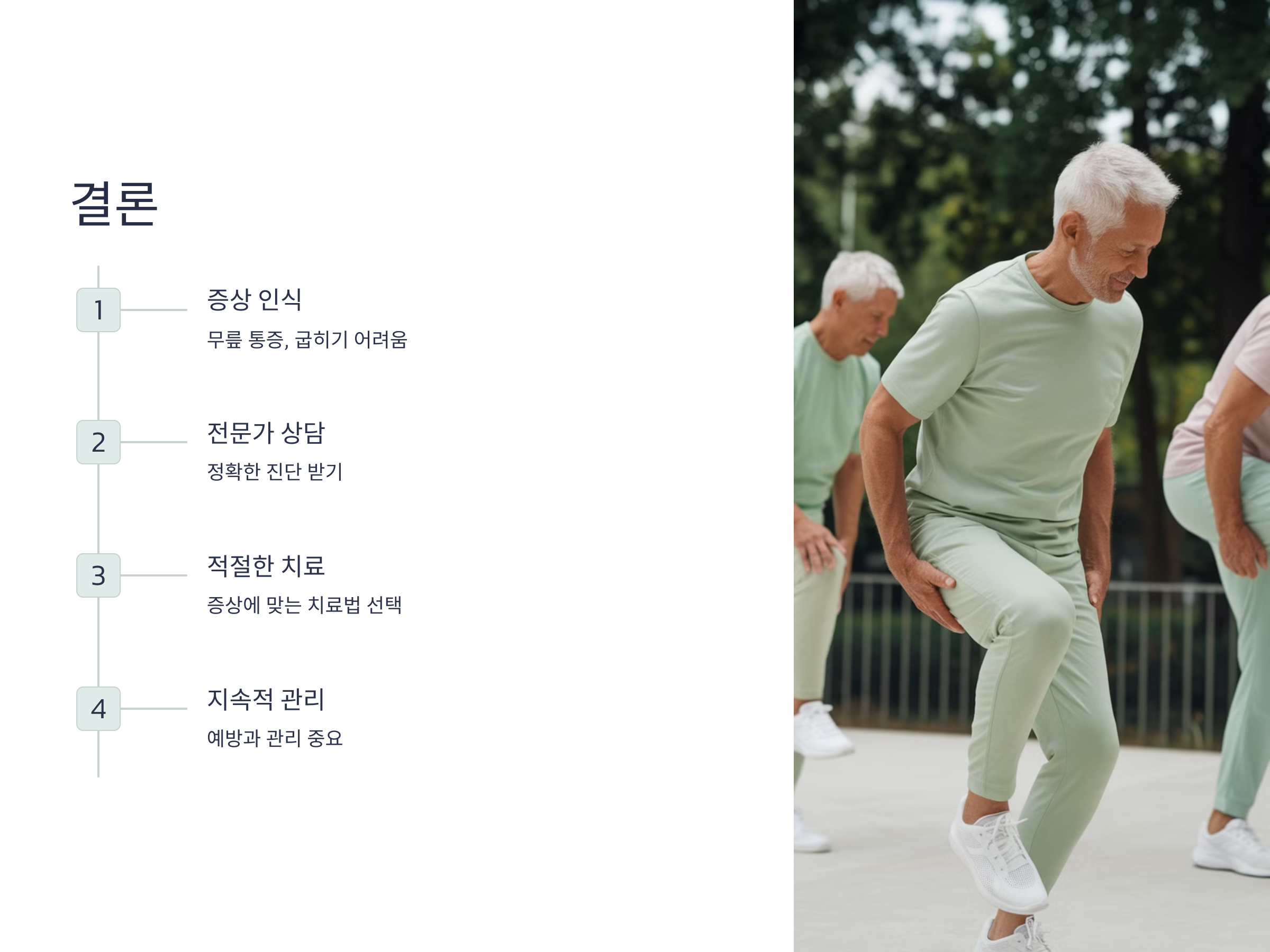 - 퇴행성 관절염: 약물, 물리치료, 체중 관리 등으로 증상을 완화하며, 진행이 심해지면 인공관절 수술을 고려할 수 있습니다.