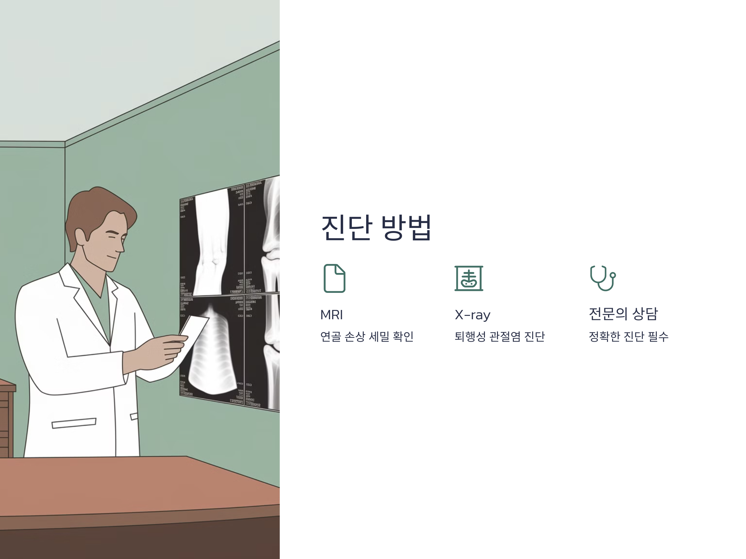 연골 손상은 MRI나 X-ray를 통해 정확하게 진단할 수 있습니다. MRI는 연골과 그 상태를 세밀하게 확인할 수 있는 검사로, 연골의 손상 정도를 파악할 수 있습니다.
