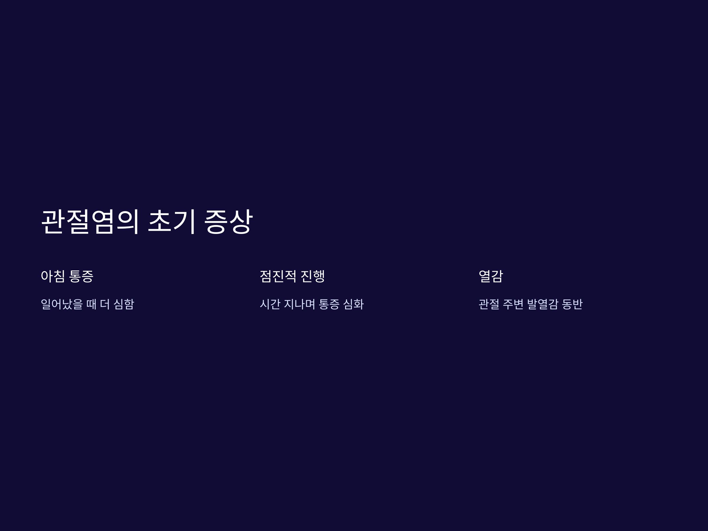 이러한 초기 증상은 대개 점차적으로 진행되며, 초기에는 가벼운 통증과 불편함을 느끼는 정도에서 시작합니다. 그러나 시간이 지나면서 통증이 심해지고, 관절이 굳어져서 일상적인 활동에 지장을 줄 수 있습니다. 관절염이 진행되면 무릎을 구부리거나 펼 때 소리가 나기도 하며, 관절 주변에 발열감이 생길 수 있습니다.