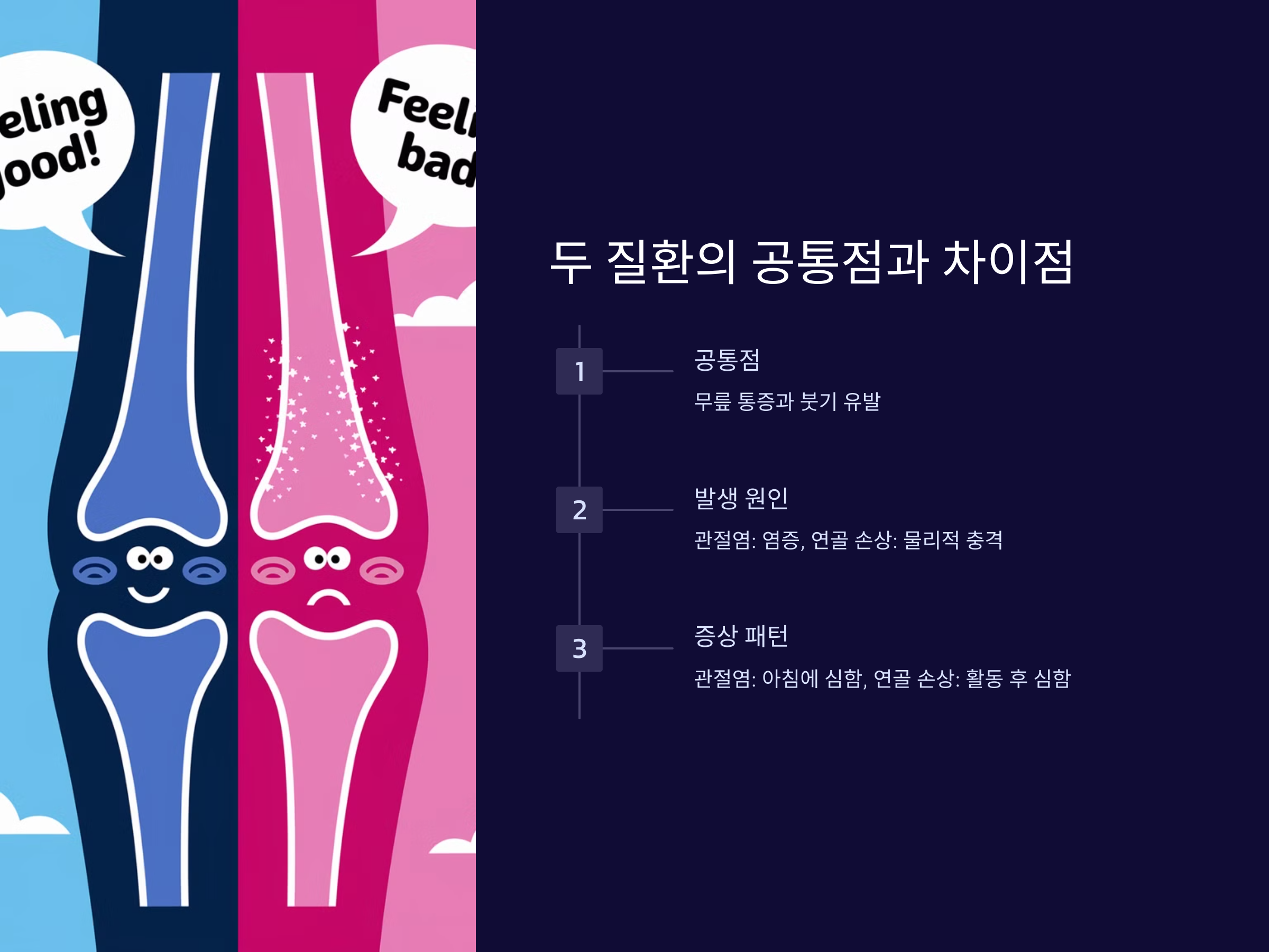 관절염과 연골 손상은 모두 무릎 부위에 통증과 붓기를 유발하는 질환이지만, 그 원인과 진행 과정에서는 중요한 차이가 있습니다. 두 질환 모두 나이가 들면서 발생할 수 있으나, 관절염은 주로 염증에 의해 발생하며, 연골 손상은 외부 충격이나 과도한 사용으로 발생합니다. 또한 관절염은 점차적으로 진행되며, 특히 아침에 일어날 때나 오랜 시간 앉아 있다가 일어날 때 통증이 심해지는 경향이 있습니다. 반면 연골 손상은 활동 후나 운동 중에 증상이 심해지는 경향이 있습니다.