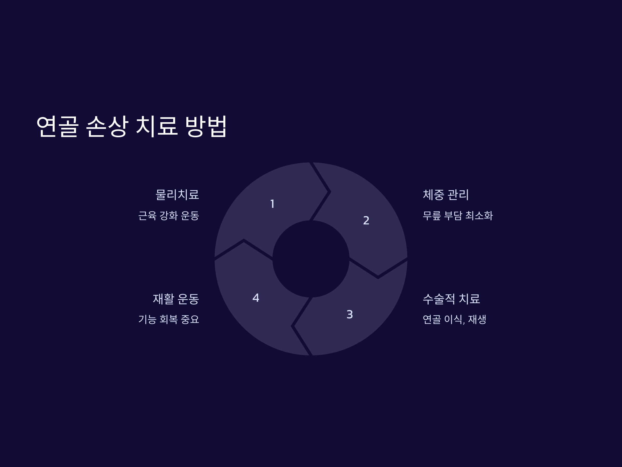 연골 손상의 치료는 손상의 정도와 위치에 따라 달라집니다. 초기 단계에서는 비수술적 치료가 우선적으로 고려됩니다. 물리치료나 운동 요법을 통해 무릎 주변의 근육을 강화하고, 무릎을 지지하는 연골에 대한 부담을 줄일 수 있습니다. 또한 체중을 관리하여 무릎에 가는 부담을 최소화하는 것이 중요합니다.